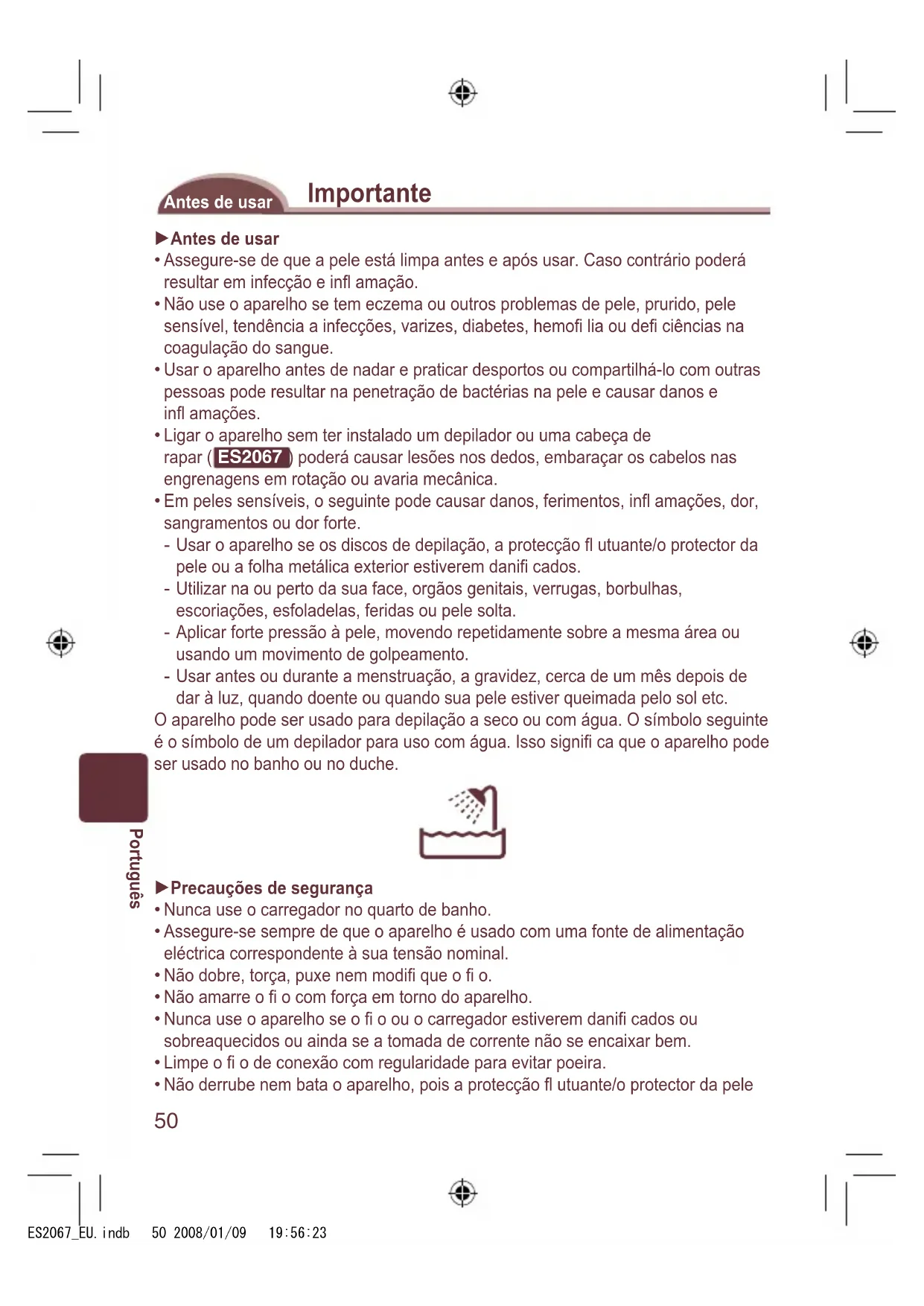 Houde Accessoires: Lader (RE7-46), reinigingsborsteltje en opbergtasje (Gebruik uitsluitend de meegeleverde accessoires.) ES2067_EU.indb 49 2008/01/09 19:56:2250 Português Importante Antes de usar Antes de usar Assegure-se de que a pele está limpa antes e após usar. Caso contrário poderá resultar em infecção e infl amação. Não use o aparelho se tem eczema ou outros problemas de pele, prurido, pele sensível, tendência a infecções, varizes, diabetes, hemofi lia ou defi ciências na coagulação do sangue. Usar o aparelho antes de nadar e praticar desportos ou compartilhá-lo com outras pessoas pode resultar na penetração de bactérias na pele e causar danos e infl amações. Ligar o aparelho sem ter instalado um depilador ou uma cabeça de rapar ( ES2067 ) poderá causar lesões nos dedos, embaraçar os cabelos nas engrenagens em rotação ou avaria mecânica. Em peles sensíveis, o seguinte pode causar danos, ferimentos, infl amações, dor, sangramentos ou dor forte. Usar o aparelho se os discos de depilação, a protecção fl utuante/o protector da pele ou a folha metálica exterior estiverem danifi cados. Utilizar na ou perto da sua face, orgãos genitais, verrugas, borbulhas, escoriações, esfoladelas, feridas ou pele solta. Aplicar forte pressão à pele, movendo repetidamente sobre a mesma área ou usando um movimento de golpeamento. Usar antes ou durante a menstruação, a gravidez, cerca de um mês depois de dar à luz, quando doente ou quando sua pele estiver queimada pelo sol etc. O aparelho pode ser usado para depilação a seco ou com água. O símbolo seguinte é o símbolo de um depilador para uso com água. Isso signifi ca que o aparelho pode ser usado no banho ou no duche. Precauções de segurança Nunca use o carregador no quarto de banho. Assegure-se sempre de que o aparelho é usado com uma fonte de alimentação eléctrica correspondente à sua tensão nominal. Não dobre, torça, puxe nem modifi que o fi o. Não amarre o fi o com força em torno do aparelho. Nunca use o aparelho se o fi o ou o carregador estiverem danifi cados ou sobreaquecidos ou ainda se a tomada de corrente não se encaixar bem. Limpe o fi o de conexão com regularidade para evitar poeira. Não derrube nem bata o aparelho, pois a protecção fl utuante/o protector da pele