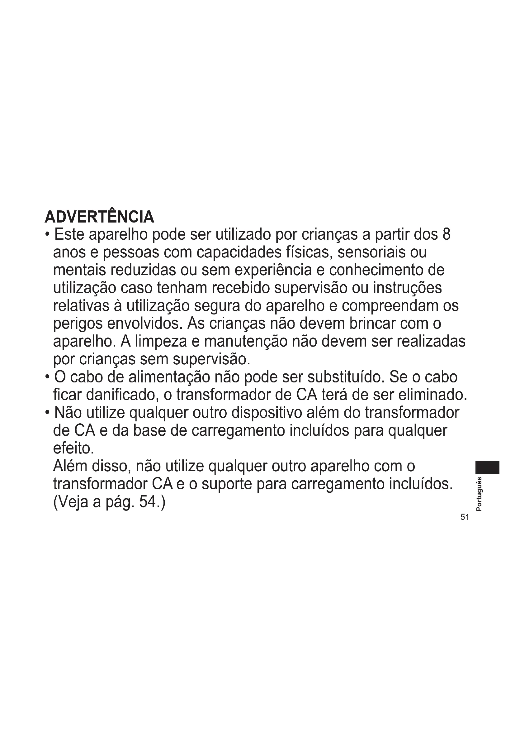 - Não utilize qualquer outro dispositivo além do transformador de CA e da base de carregamento incluídos para qualquer efeito. Além disso, não utilize qualquer outro aparelho com o transformador CA e o suporte para carregamento incluídos. (Veja a pág. 54.)52 Português