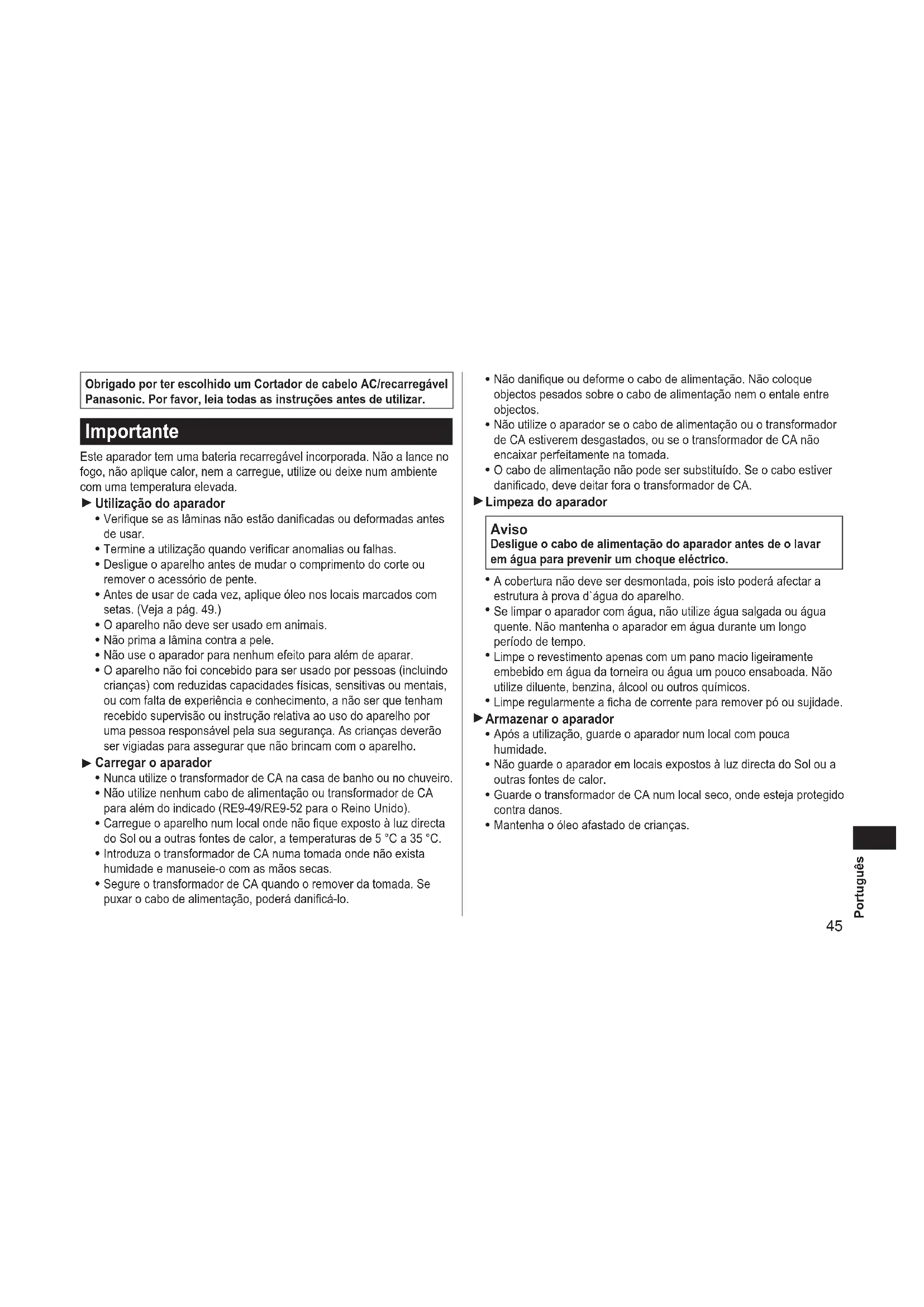 Obrigado por ter escolhido um Cortador de cabelo AC/recarregável Panasonic. Por favor, leia todas as instruções antes de utilizar. Importante Este aparador tem uma bateria recarregável incorporada. Não a lance no fogo, não aplique calor, nem a carregue, utilize ou deixe num ambiente com uma temperatura elevada. Utilização do aparador Verique se as lâminas não estão danicadas ou deformadas antes de usar. Termine a utilização quando vericar anomalias ou falhas. Desligue o aparelho antes de mudar o comprimento do corte ou remover o acessório de pente. Antes de usar de cada vez, aplique óleo nos locais marcados com setas. (Veja a pág. 49.) O aparelho não deve ser usado em animais. Não prima a lâmina contra a pele. Não use o aparador para nenhum efeito para além de aparar. O aparelho não foi concebido para ser usado por pessoas (incluindo crianças) com reduzidas capacidades físicas, sensitivas ou mentais, ou com falta de experiência e conhecimento, a não ser que tenham recebido supervisão ou instrução relativa ao uso do aparelho por uma pessoa responsável pela sua segurança. As crianças deverão ser vigiadas para assegurar que não brincam com o aparelho. Carregar o aparador Nunca utilize o transformador de CA na casa de banho ou no chuveiro. Não utilize nenhum cabo de alimentação ou transformador de CA para além do indicado (RE9‑49/RE9‑52 para o Reino Unido). Carregue o aparelho num local onde não que exposto à luz directa do Sol ou a outras fontes de calor, a temperaturas de 5 °C a 35 °C. Introduza o transformador de CA numa tomada onde não exista humidade e manuseie‑o com as mãos secas. Segure o transformador de CA quando o remover da tomada. Se puxar o cabo de alimentação, poderá danicá‑lo.