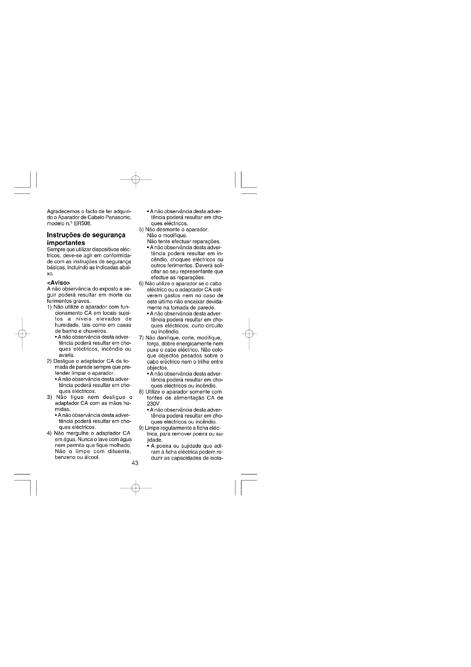 Agradecemos o facto de ter adquiri- do o Aparador de Cabelo Panasonic, modelo n.º ER508. Instruções de segurança importantes Sempre que utilizar dispositivos eléc- tricos, deve-se agir em conformida- de com as instruções de segurança básicas, incluindo as indicadas abai- xo. <Aviso> A não observância do exposto a se- guir poderá resultar em morte ou ferimentos graves.