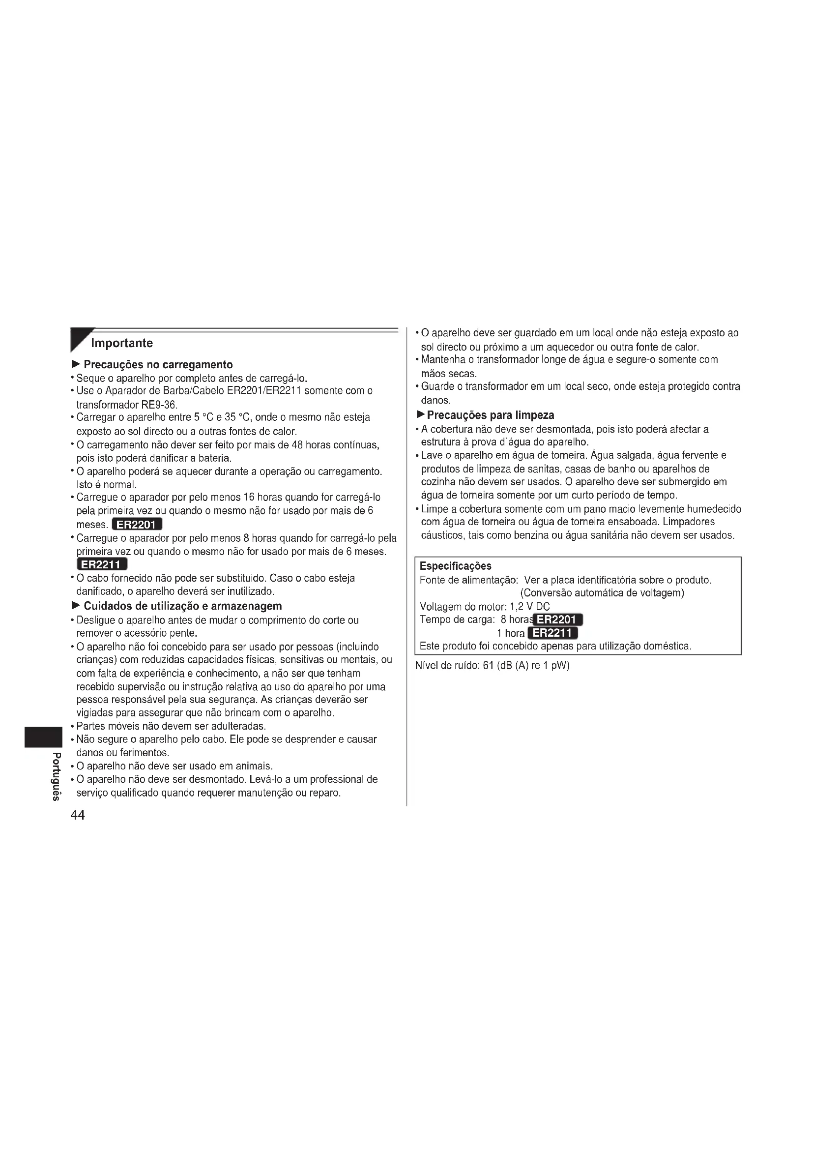 O aparelho deve ser guardado em um local onde não esteja exposto ao sol directo ou próximo a um aquecedor ou outra fonte de calor. Mantenha o transformador longe de água e segure-o somente com mãos secas. Guarde o transformador em um local seco, onde esteja protegido contra danos. Precauções para limpeza A cobertura não deve ser desmontada, pois isto poderá afectar a estrutura à prova d`água do aparelho. Lave o aparelho em água de torneira. Água salgada, água fervente e produtos de limpeza de sanitas, casas de banho ou aparelhos de cozinha não devem ser usados. O aparelho deve ser submergido em água de torneira somente por um curto período de tempo. Limpe a cobertura somente com um pano macio levemente humedecido com água de torneira ou água de torneira ensaboada. Limpadores cáusticos, tais como benzina ou água sanitária não devem ser usados. Especicações Fonte de alimentação: Ver a placa identicatória sobre o produto. (Conversão automática de voltagem) Voltagem do motor: 1,2 V DC Tempo de carga: 8 horas ER2201 1 hora ER2211 Este produto foi concebido apenas para utilização doméstica. Nível de ruído: 61 (dB (A) re 1 pW)