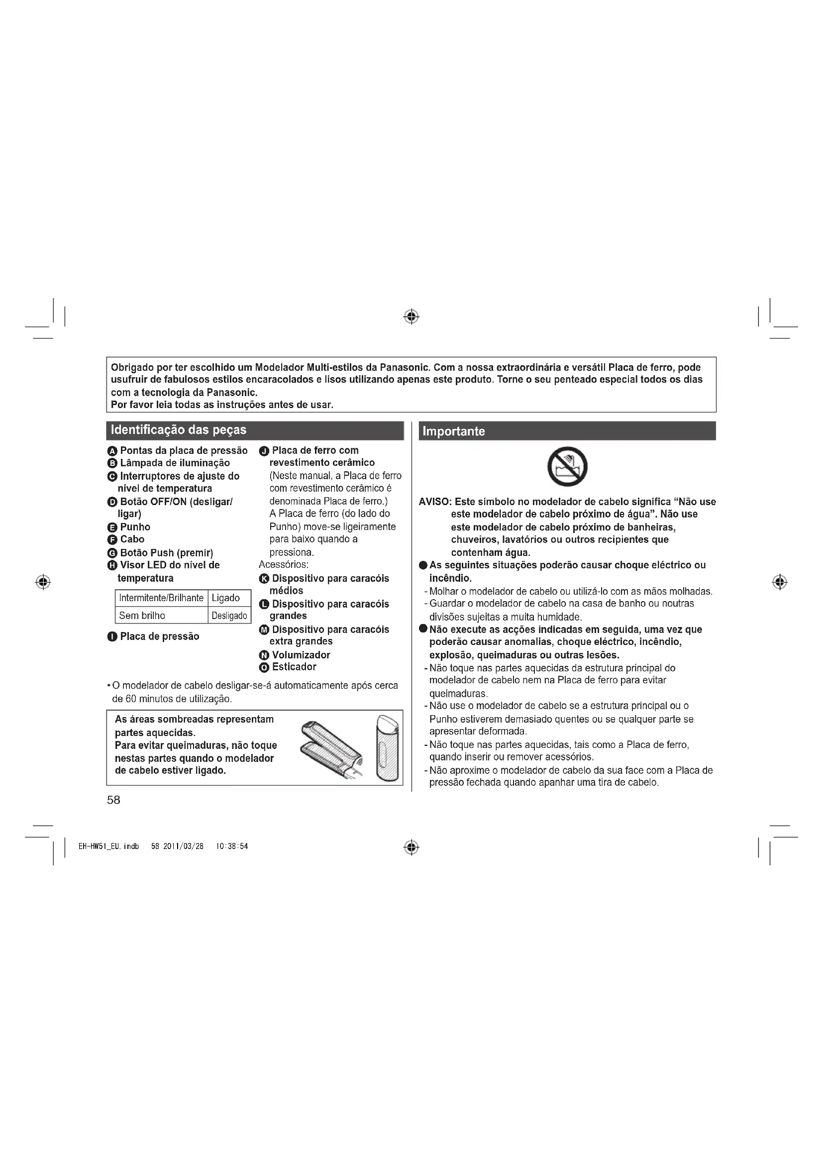 EH-HW51_EU.indb 57 2011/03/28 10:38:5458 Obrigado por ter escolhido um Modelador Multi-estilos da Panasonic. Com a nossa extraordinária e versátil Placa de ferro, pode usufruir de fabulosos estilos encaracolados e lisos utilizando apenas este produto. Torne o seu penteado especial todos os dias com a tecnologia da Panasonic Por favor leia todas as instruções antes de usar Identicação das peças