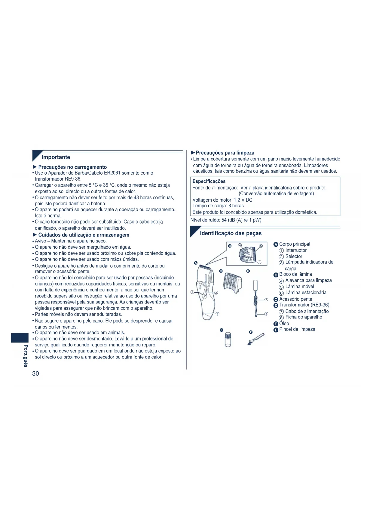 - 30 Português Importante Precauções no carregamento Use o Aparador de Barba/Cabelo ER2061 somente com o transformador RE9-36. Carregar o aparelho entre 5 °C e 35 °C, onde o mesmo não esteja exposto ao sol directo ou a outras fontes de calor. O carregamento não dever ser feito por mais de 48 horas contínuas, pois isto poderá danicar a bateria. O aparelho poderá se aquecer durante a operação ou carregamento. Isto é normal. O cabo fornecido não pode ser substituido. Caso o cabo esteja danicado, o aparelho deverá ser inutilizado. Cuidados de utilização e armazenagem Aviso – Mantenha o aparelho seco. O aparelho não deve ser mergulhado em água. O aparelho não deve ser usado próximo ou sobre pia contendo água. O aparelho não deve ser usado com mãos úmidas. Desligue o aparelho antes de mudar o comprimento do corte ou remover o acessório pente. O aparelho não foi concebido para ser usado por pessoas (incluindo crianças) com reduzidas capacidades físicas, sensitivas ou mentais, ou com falta de experiência e conhecimento, a não ser que tenham recebido supervisão ou instrução relativa ao uso do aparelho por uma pessoa responsável pela sua segurança. As crianças deverão ser vigiadas para assegurar que não brincam com o aparelho. Partes móveis não devem ser adulteradas. Não segure o aparelho pelo cabo. Ele pode se desprender e causar danos ou ferimentos. O aparelho não deve ser usado em animais. O aparelho não deve ser desmontado. Levá‑lo a um professional de serviço qualicado quando requerer manutenção ou reparo. O aparelho deve ser guardado em um local onde não esteja exposto ao sol directo ou próximo a um aquecedor ou outra fonte de calor.