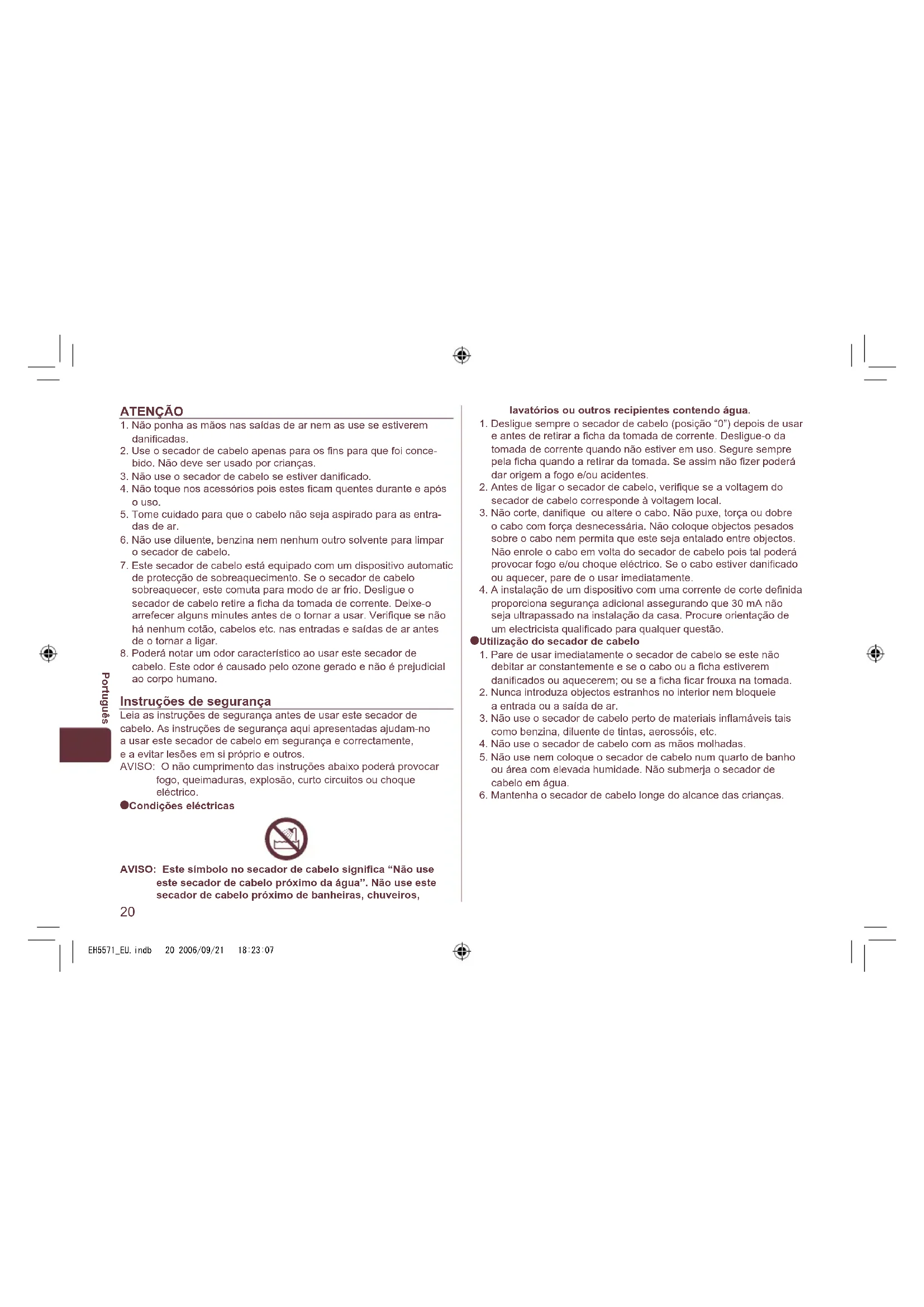 Condições eléctricas AVISO: Este símbolo no secador de cabelo significa “Não use este secador de cabelo próximo da água”. Não use este secador de cabelo próximo de banheiras, chuveiros, lavatórios ou outros recipientes contendo água.