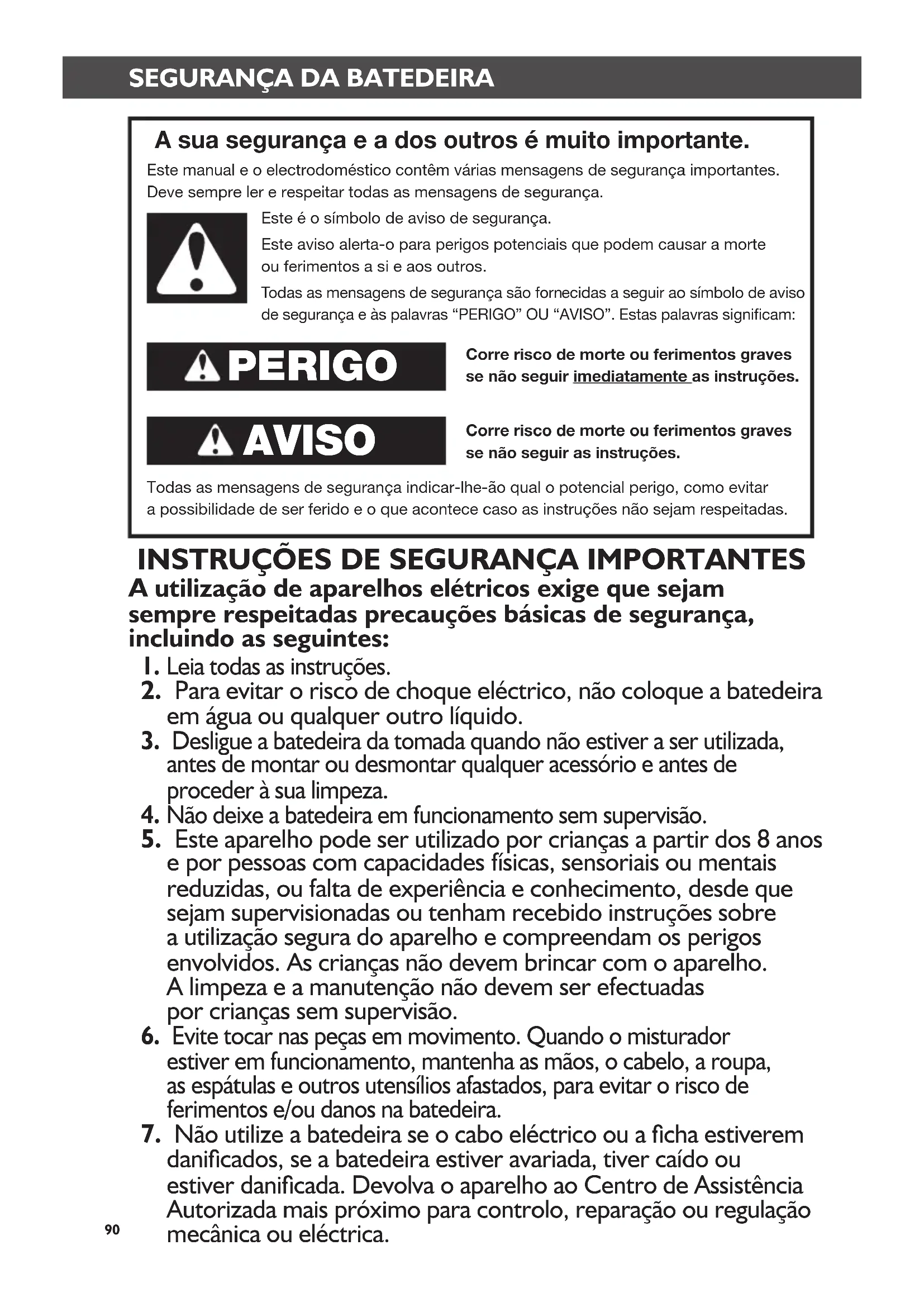 A sua segurança e a dos outros é muito importante. Este manual e o electrodoméstico contêm várias mensagens de segurança importantes. Deve sempre ler e respeitar todas as mensagens de segurança. Este é o símbolo de aviso de segurança. Este aviso alerta-o para perigos potenciais que podem causar a morte ou ferimentos a si e aos outros. Todas as mensagens de segurança são fornecidas a seguir ao símbolo de aviso de segurança e às palavras “PERIGO” OU “AVISO”. Estas palavras significam: Corre risco de morte ou ferimentos graves se não seguir imediatamente as instruções. Corre risco de morte ou ferimentos graves se não seguir as instruções. Todas as mensagens de segurança indicar-lhe-ão qual o potencial perigo, como evitar a possibilidade de ser ferido e o que acontece caso as instruções não sejam respeitadas. PERIGO AVISO91 Português