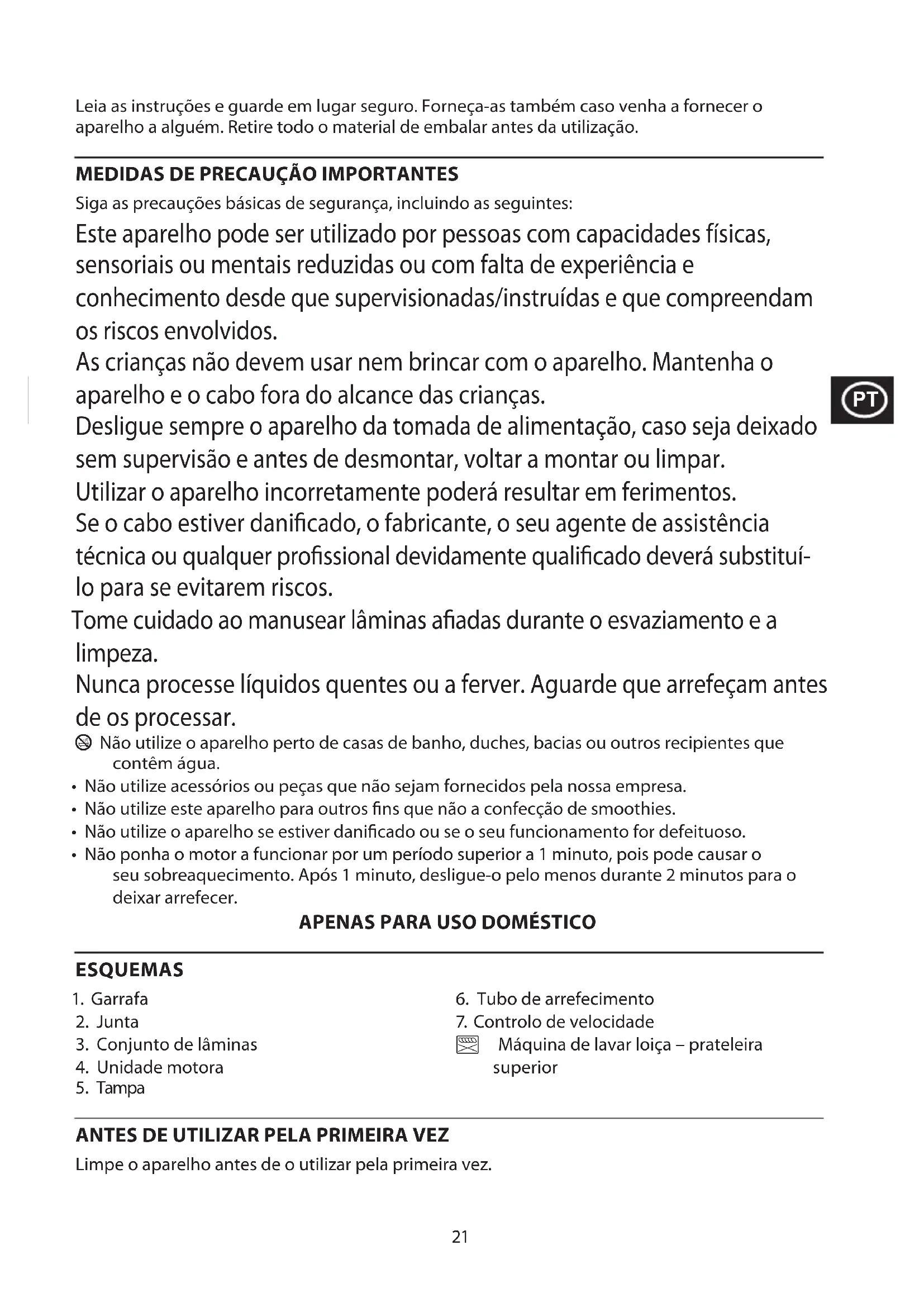 Siga as precauções básicas de segurança, incluindo as seguintes: Este aparelho pode ser utilizado por pessoas com capacidades físicas, sensoriais ou mentais reduzidas ou com falta de experiência e conhecimento desde que supervisionadas/instruídas e que compreendam os riscos envolvidos. As crianças não devem usar nem brincar com o aparelho. Mantenha o aparelho e o cabo fora do alcance das crianças. Desligue sempre o aparelho da tomada de alimentação, caso seja deixado sem supervisão e antes de desmontar, voltar a montar ou limpar. Utilizar o aparelho incorretamente poderá resultar em ferimentos. Se o cabo estiver danicado, o fabricante, o seu agente de assistência técnica ou qualquer prossional devidamente qualicado deverá substituí- lo para se evitarem riscos. Tome cuidado ao manusear lâminas aadas durante o esvaziamento e a limpeza. Nunca processe líquidos quentes ou a ferver. Aguarde que arrefeçam antes de os processar. b Não utilize o aparelho perto de casas de banho, duches, bacias ou outros recipientes que contêm água.