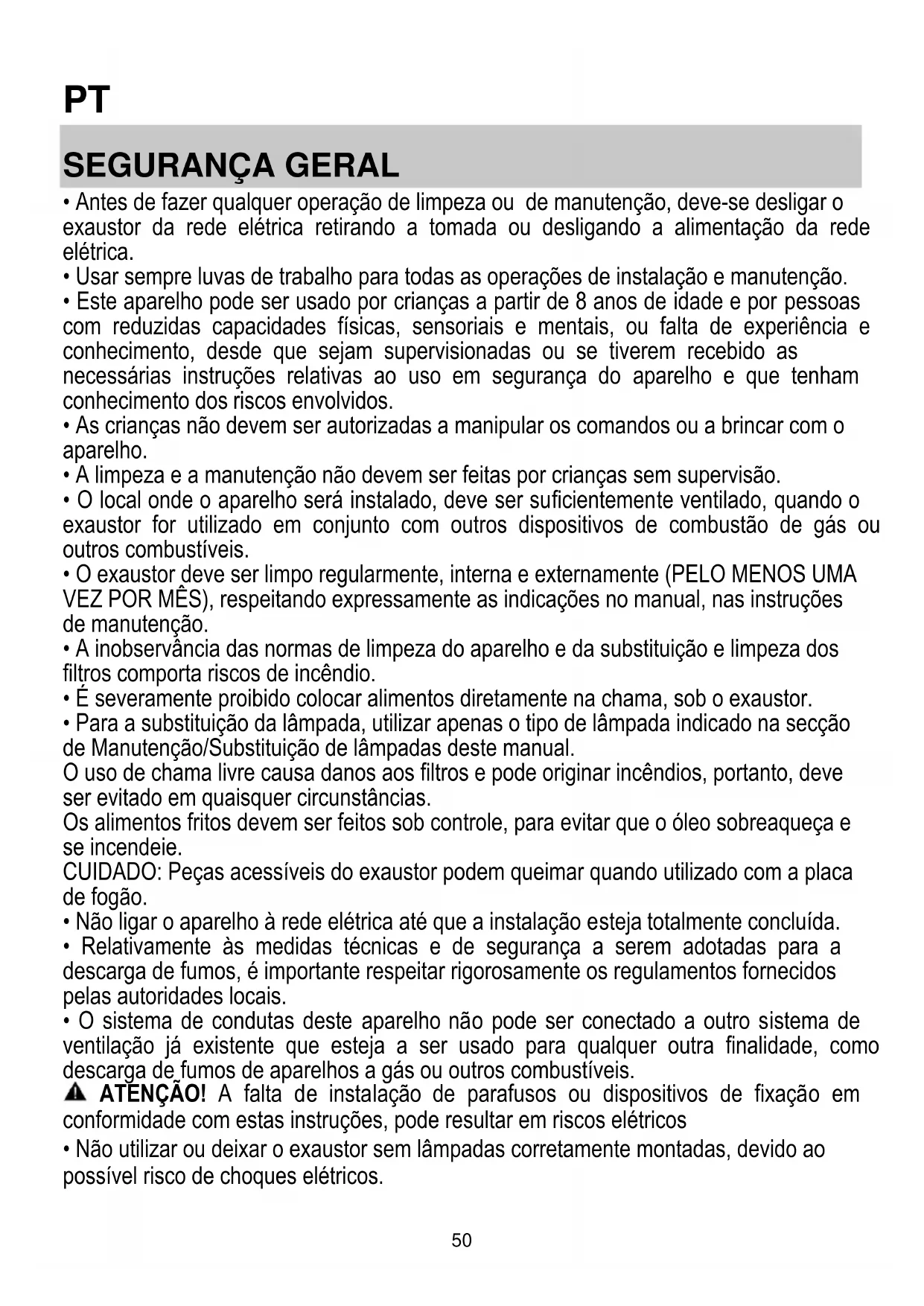 - Não utilizar ou deixar o exaustor sem lâmpadas corretamente montadas, devido ao possível risco de choques elétricos.51