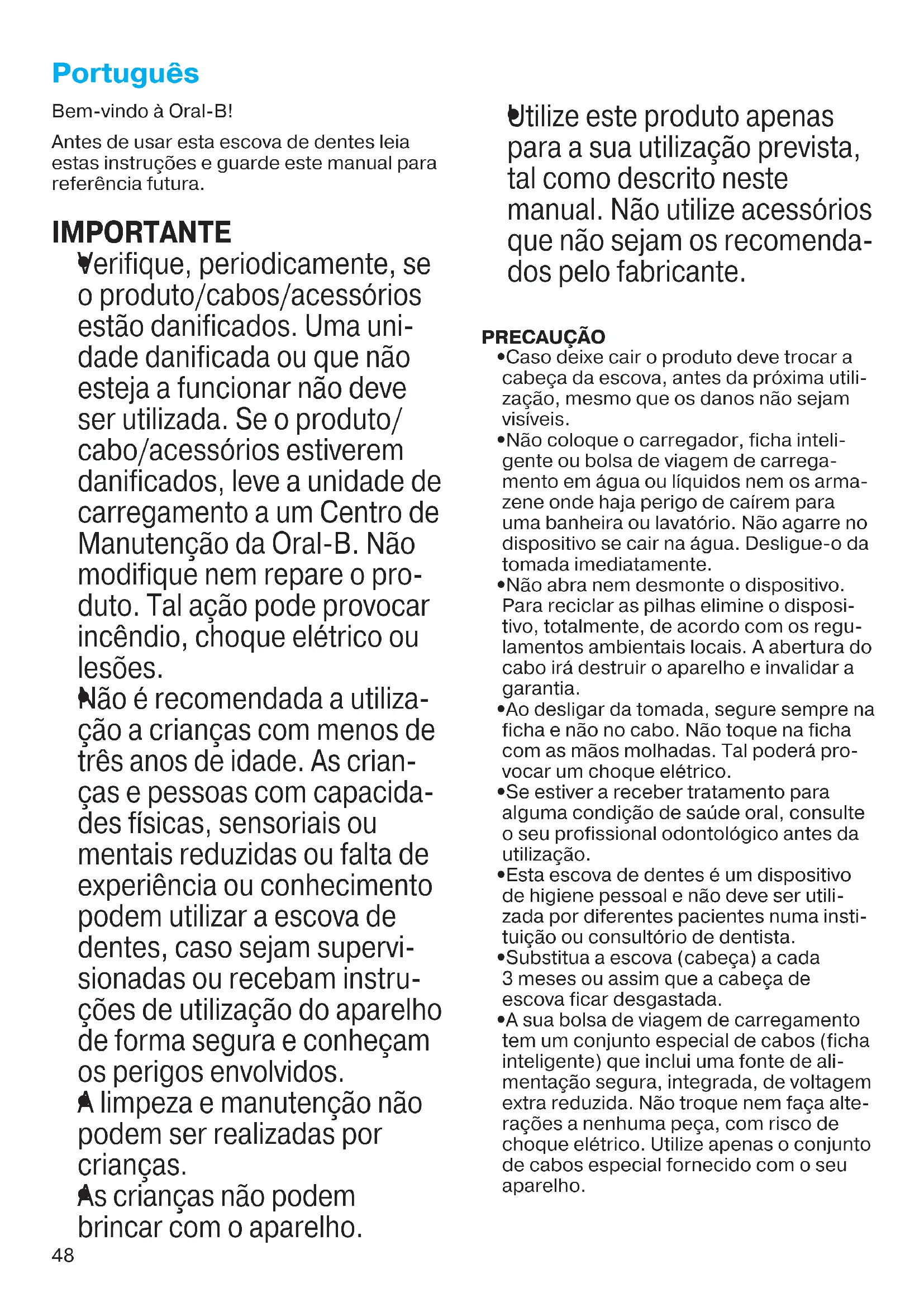 Verifique, periodically, se o produit/cabos/cessórios está danificados. Umaunities danificada ou que não esteja a functionar não deve ser realizada. Se o produits/ cabo/cessórios estiverem danificados, delve aunities de correamento a um Centro de Manutençao da Oral-B. Não modifique nem repar o produit. Tal ação pode provocar incêndio,CHOque eletrico ou lesões.