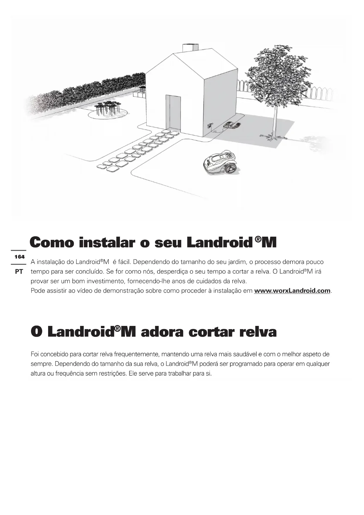 M irá provar ser um bom investimento, fornecendo-lhe anos de cuidados da relva. Pode assistir ao vídeo de demonstração sobre como proceder à instalação em www.worxLandroid.com. O Landroid