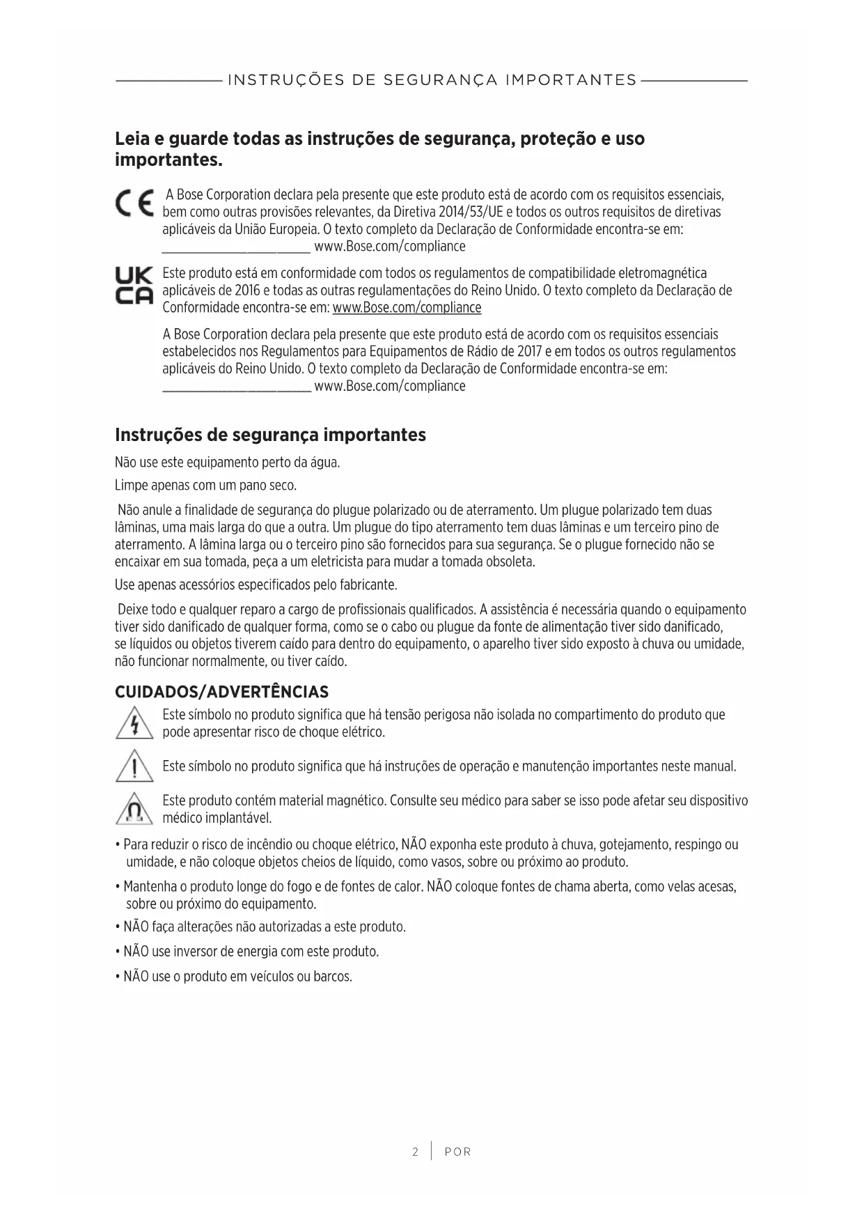 POR Leia e guarde todas as instruções de segurança, proteção e uso importantes. A Bose Corporation declara pela presente que este produto está de acordo com os requisitos essenciais, bemcomo outras provisões relevantes, da Diretiva 2014/53/UE e todos os outros requisitos de diretivas aplicáveis da União Europeia. O texto completo da Declaração de Conformidade encontra-se em: www.Bose.com/compliancewww.Bose.com/compliance Este produto está em conformidade com todos os regulamentos de compatibilidade eletromagnética aplicáveis de 2016 e todas as outras regulamentações do Reino Unido. O texto completo da Declaração de Conformidade encontra-se em: www.Bose.com/compliancewww.Bose.com/compliance A Bose Corporation declara pela presente que este produto está de acordo com os requisitos essenciais estabelecidos nos Regulamentos para Equipamentos de Rádio de 2017 e em todos os outros regulamentos aplicáveis do Reino Unido. O texto completo da Declaração de Conformidade encontra-se em: www.Bose.com/compliancewww.Bose.com/compliance Instruções de segurança importantes Não use este equipamento perto da água. Limpe apenas com um pano seco. Não anule a finalidade de segurança do plugue polarizado ou de aterramento. Um plugue polarizado tem duas lâminas, uma mais larga do que a outra. Um plugue do tipo aterramento tem duas lâminas e um terceiro pino de aterramento. A lâmina larga ou o terceiro pino são fornecidos para sua segurança. Se o plugue fornecido não se encaixar em sua tomada, peça a um eletricista para mudar a tomada obsoleta. Use apenas acessórios especificados pelo fabricante. Deixe todo e qualquer reparo a cargo de profissionais qualificados. A assistência é necessária quando o equipamento tiver sido danificado de qualquer forma, como se o cabo ou plugue da fonte de alimentação tiver sido danificado, selíquidos ou objetos tiverem caído para dentro do equipamento, o aparelho tiver sido exposto à chuva ou umidade, não funcionar normalmente, ou tiver caído.