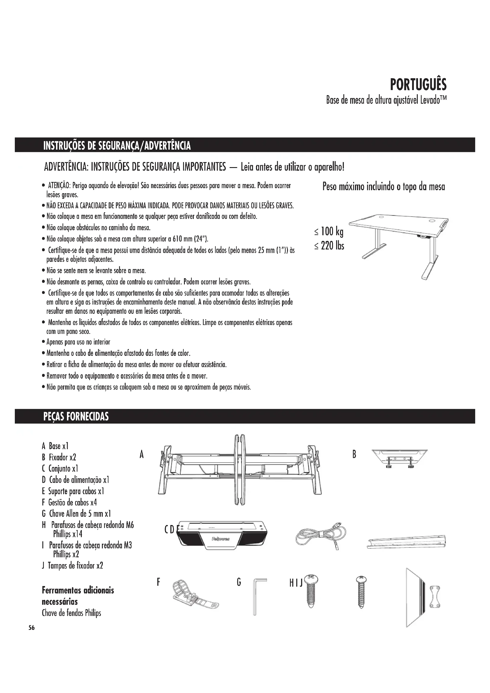 ADVERTÊNCIA: INSTRUÇÕES DE SEGURANÇA IMPORTANTES — Leia antes de utilizar o aparelho! ≤ 220 lbs Peso máximo incluindo o topo da mesa ≤ 100 kg A Base x1 B Fixador x2 C Conjunto x1 D Cabo de alimentação x1 E Suporte para cabos x1 F Gestão de cabos x4 G Chave Allen de 5 mm x1 H Parafusos de cabeça redonda M6 Phillips x14 I Parafusos de cabeça redonda M3 Phillips x2 J Tampas de fixador x2 Ferramentas adicionais necessárias Chave de fendas Philips
