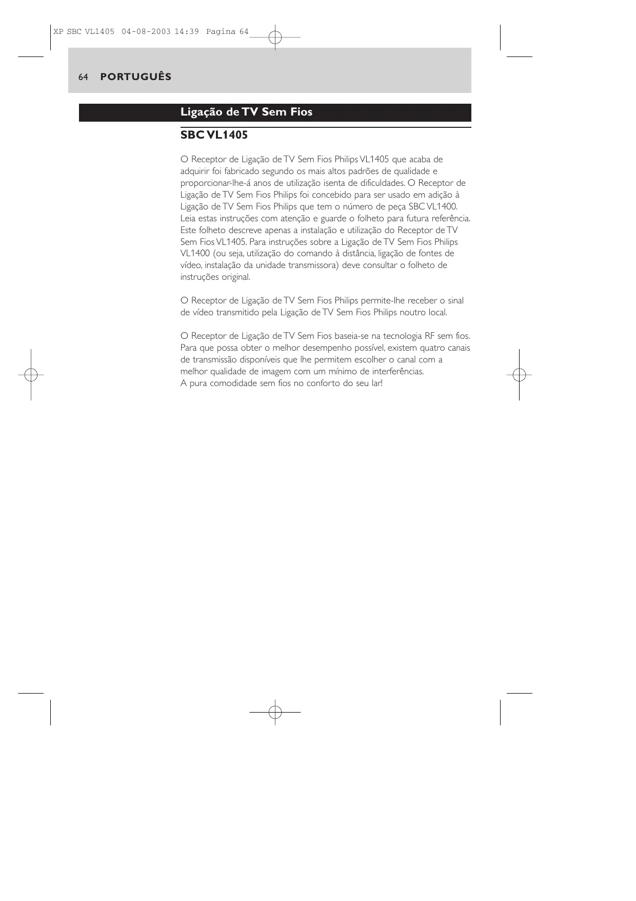 PORTUGUÊS Ligação de TV Sem Fios SBC VL1405 O Receptor de Ligação de TV Sem Fios Philips VL1405 que acaba de adquirir foi fabricado segundo os mais altos padrões de qualidade e proporcionar-lhe-á anos de utilização isenta de dificuldades. O Receptor de Ligação de TV Sem Fios Philips foi concebido para ser usado em adição à Ligação de TV Sem Fios Philips que tem o número de peça SBC VL1400. Leia estas instruções com atenção e guarde o folheto para futura referência. Este folheto descreve apenas a instalação e utilização do Receptor de TV Sem Fios VL1405. Para instruções sobre a Ligação de TV Sem Fios Philips VL1400 (ou seja, utilização do comando à distância, ligação de fontes de vídeo, instalação da unidade transmissora) deve consultar o folheto de instruções original. O Receptor de Ligação de TV Sem Fios Philips permite-lhe receber o sinal de vídeo transmitido pela Ligação de TV Sem Fios Philips noutro local. O Receptor de Ligação de TV Sem Fios baseia-se na tecnologia RF sem fios. Para que possa obter o melhor desempenho possível, existem quatro canais de transmissão disponíveis que lhe permitem escolher o canal com a melhor qualidade de imagem com um mínimo de interferências. A pura comodidade sem fios no conforto do seu lar! XP SBC VL1405 04-08-2003 14:39 Pagina 65 PORTUGUÊS