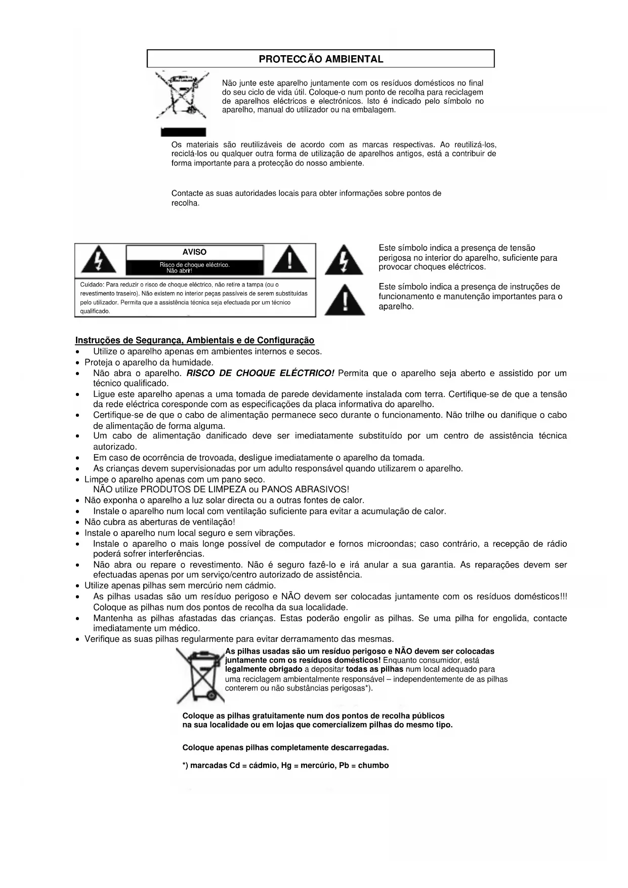 Cuidado: Para reduzir o risco de choque eléctrico, não retire a tampa (ou o revestimento traseiro). Não existem no interior peças passíveis de serem substituídas pelo utilizador. Permita que a assistência técnica seja efectuada por um técnico qualificado. As pilhas usadas são um resíduo perigoso e NÃO devem ser colocadas