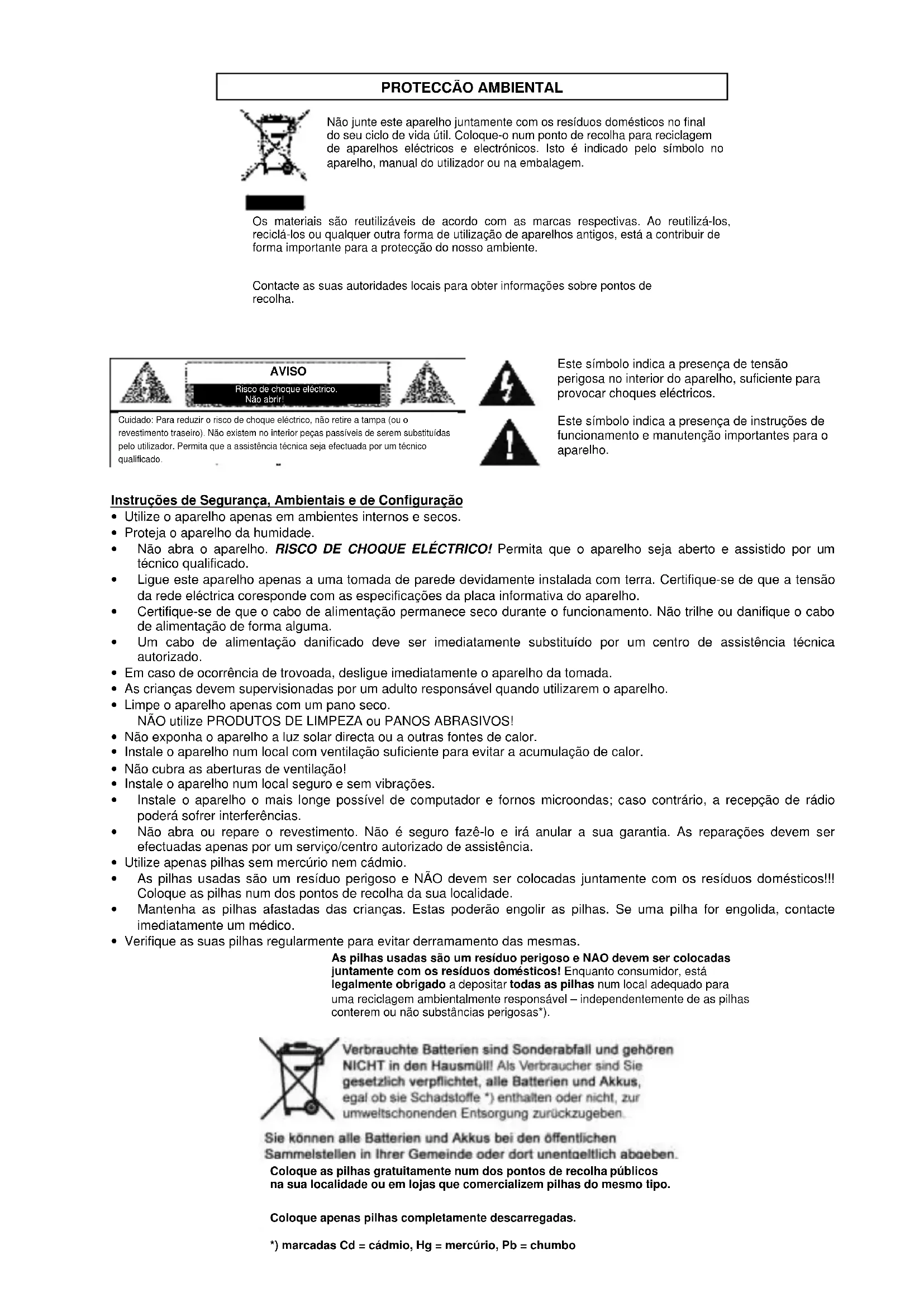 Proteja o aparelho da humidade. - Não abra o aparecido. RISCO DE CHOQUE ELETRICO! Permita que o aparecido soit aberto e assistido por um专业技术o qualificado.