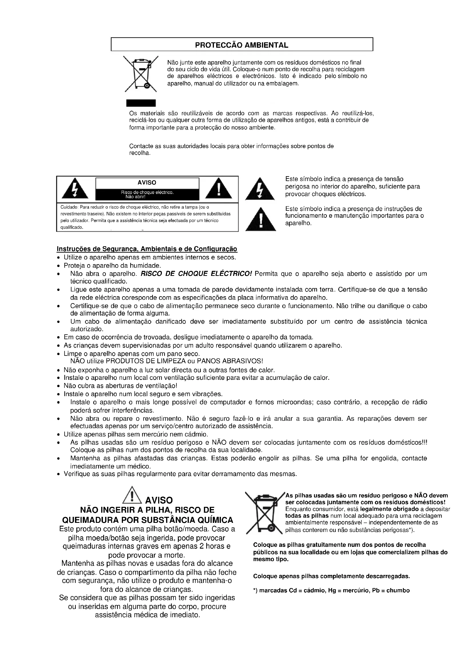 As pilhas usadas são um residuo perigoso e NAO devem ser colocadas juntamente com os residuos domesticos!! Colque as pilhas num dos pontos de recolha da sua localidade. - Mantenha as pilhas afastadas das crianças. Estas poderao engolir as pilhas. Se uma pilha for engolda, contacte imeditamente um medico.