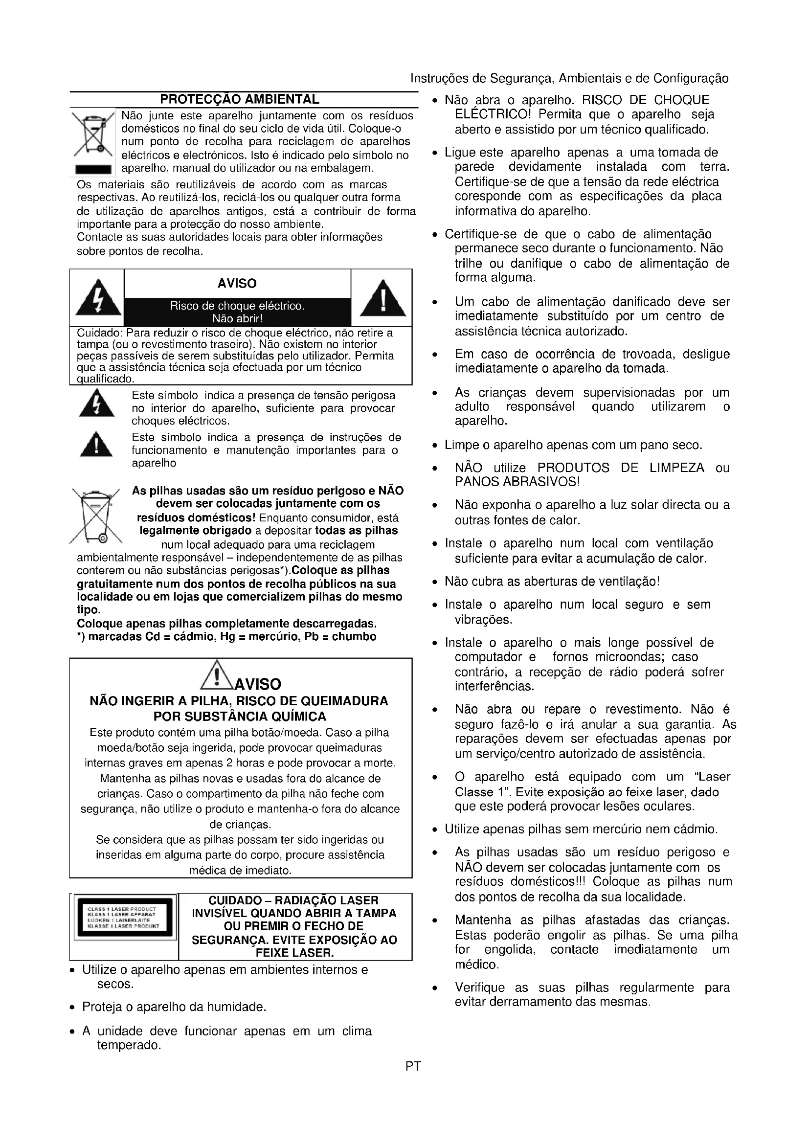 Utilize o aparelho apenas em ambientes internos e secos. Proteja o aparelho da humidade. A unidade deve funcionar apenas em um clima temperado. Não abra o aparelho. RISCO DE CHOQUE ELÉCTRICO! Permita que o aparelho seja aberto e assistido por um técnico qualificado. Ligue este aparelho apenas a uma tomada de parede devidamente instalada com terra. Certifique-se de que a tensão da rede eléctrica coresponde com as especificações da placa informativa do aparelho. Certifique-se de que o cabo de alimentação permanece seco durante o funcionamento. Não trilhe ou danifique o cabo de alimentação de forma alguma. Um cabo de alimentação danificado deve ser imediatamente substituído por um centro de assistência técnica autorizado. Em caso de ocorrência de trovoada, desligue imediatamente o aparelho da tomada. As crianças devem supervisionadas por um adulto responsável quando utilizarem o aparelho. Limpe o aparelho apenas com um pano seco. NÃO utilize PRODUTOS DE LIMPEZA ou PANOS ABRASIVOS! Não exponha o aparelho a luz solar directa ou a outras fontes de calor. Instale o aparelho num local com ventilação suficiente para evitar a acumulação de calor. Não cubra as aberturas de ventilação! Instale o aparelho num local seguro e sem vibrações. Instale o aparelho o mais longe possível de computador e fornos microondas; caso contrário, a recepção de rádio poderá sofrer interferências. Não abra ou repare o revestimento. Não é seguro fazê-lo e irá anular a sua garantia. As reparações devem ser efectuadas apenas por um serviço/centro autorizado de assistência. O aparelho está equipado com um “Laser Classe 1”. Evite exposição ao feixe laser, dado que este poderá provocar lesões oculares. Utilize apenas pilhas sem mercúrio nem cádmio. As pilhas usadas são um resíduo perigoso e NÃO devem ser colocadas juntamente com os resíduos domésticos!!! Coloque as pilhas num dos pontos de recolha da sua localidade. Mantenha as pilhas afastadas das crianças. Estas poderão engolir as pilhas. Se uma pilha for engolida, contacte imediatamente um médico. Verifique as suas pilhas regularmente para evitar derramamento das mesmas.KCD1600