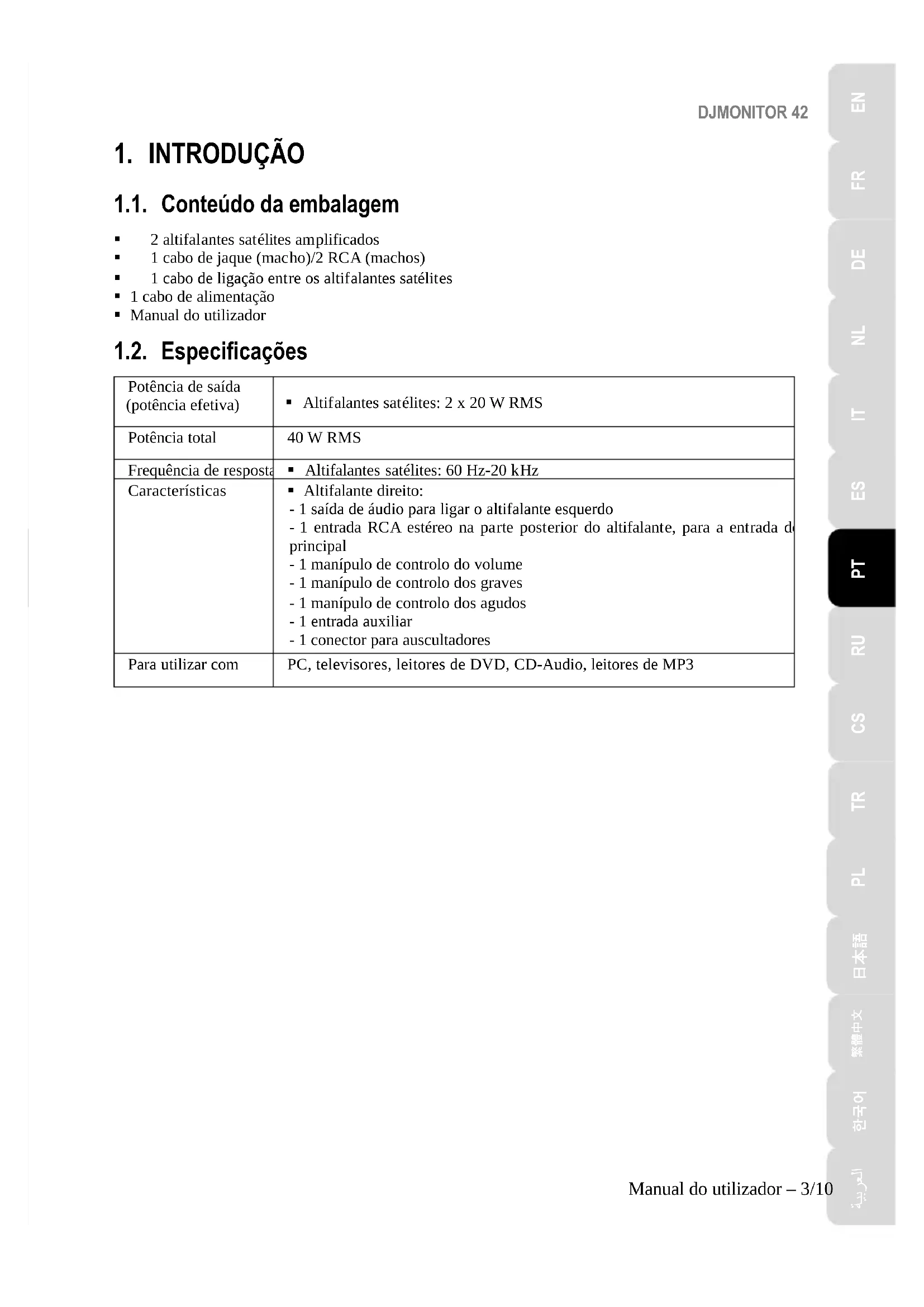 1.1. Conteúdo da embalagem 2 altifalantes satélites amplificados 1 cabo de jaque (macho)/2 RCA (machos) 1 cabo de ligação entre os altifalantes satélites 1 cabo de alimentação Manual do utilizador 1.2. Especificações Potência de saída (potência efetiva) Altifalantes satélites: 2 x 20 W RMS Potência total 40 W RMS Frequência de resposta Altifalantes satélites: 60 Hz-20 kHz Características Altifalante direito: - 1 saída de áudio para ligar o altifalante esquerdo