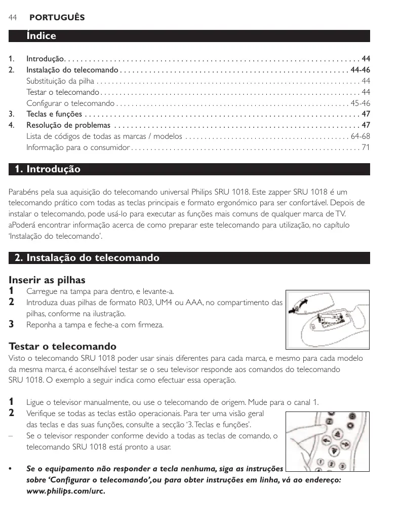 Parabéns pela sua aquisição do telecomando universal Philips SRU 1018. Este zapper SRU 1018 é um telecomando prático com todas as teclas principais e formato ergonómico para ser confortável. Depois de instalar o telecomando, pode usá-lo para executar as funções mais comuns de qualquer marca de TV. aPoderá encontrar informação acerca de como preparar este telecomando para utilização, no capítulo ‘Instalação do telecomando’.