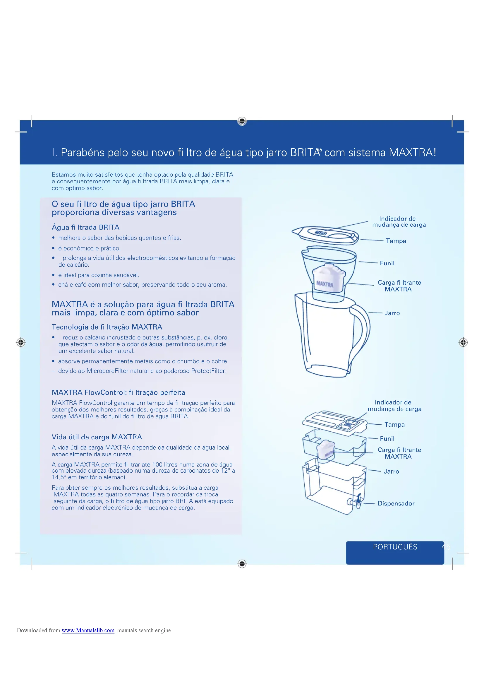 - reduz o calcário incrustado e outras substâncias, p. ex. cloro, que afectam o sabor e o odor da água, permitindo usufruir de um excelente sabor natural.• absorve permanentemente metais como o chumbo e o cobre.– devido ao MicroporeFilter natural e ao poderoso ProtectFilter. MAXTRA FlowControl: fi ltração perfeita MAXTRA FlowControl garante um tempo de fi ltração perfeito para obtenção dos melhores resultados, graças à combinação ideal da carga MAXTRA e do funil do fi ltro de água BRITA. Vida útil da carga MAXTRA A vida útil da carga MAXTRA depende da qualidade da água local, especialmente da sua dureza.A carga MAXTRA permite fi ltrar até 100 litros numa zona de água com elevada dureza (baseado numa dureza de carbonatos de 12° a 14,5° em território alemão).Para obter sempre os melhores resultados, substitua a carga MAXTRA todas as quatro semanas. Para o recordar da troca seguinte da carga, o fi ltro de água tipo jarro BRITA está equipado com um indicador electrónico de mudança de carga. Downloaded from www.Manualslib.com manuals search engine46 PORTUGUÊS