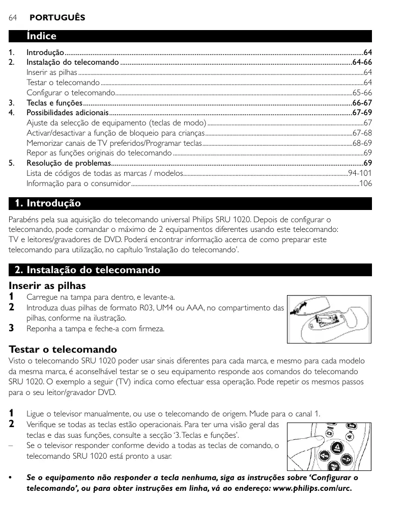 Parabéns pela sua aquisição do telecomando universal Philips SRU 1020. Depois de configurar o telecomando, pode comandar o máximo de 2 equipamentos diferentes usando este telecomando: TV e leitores/gravadores de DVD. Poderá encontrar informação acerca de como preparar este telecomando para utilização, no capítulo ‘Instalação do telecomando’.