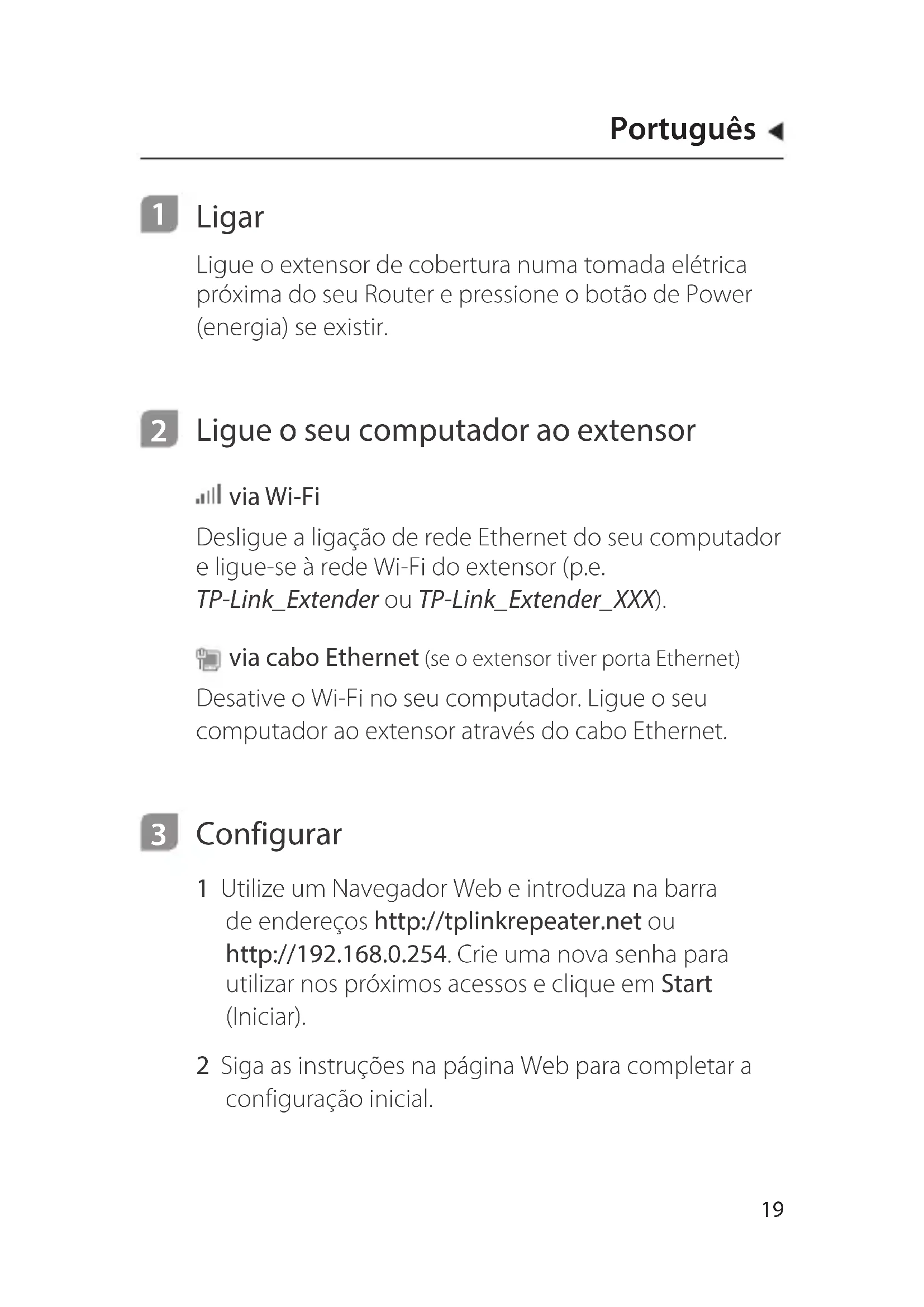 Configurar 1 Utilize um Navegador Web e introduza na barra de endereços http://tplinkrepeater.net ou http://192.168.0.254. Crie uma nova senha para utilizar nos próximos acessos e clique em Start (Iniciar). 2 Siga as instruções na página Web para completar a configuração inicial.Português