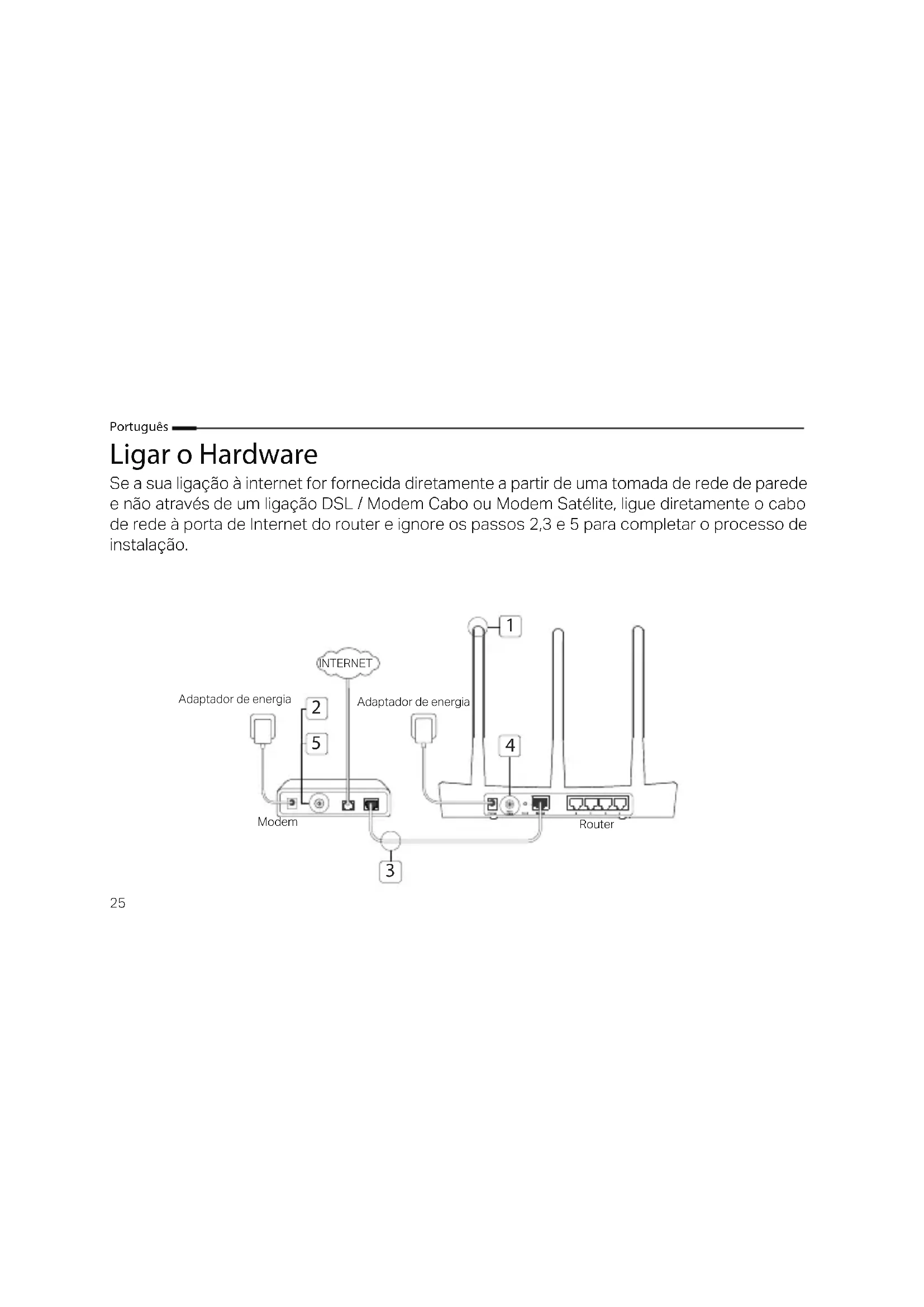 - Fate login alla pagina di gestione web per ottenere o resettare la vostra password wireless. Nota: Per saperne di più riguardo il router, andate sul sito web https://www.tp-link.it per scaricare la guida utente del router.25 Português Ligar o Hardware Se a sua ligação à internet for fornecida diretamente a partir de uma tomada de rede de parede e não através de um ligação DSL / Modem Cabo ou Modem Satélite, ligue diretamente o cabo de rede à porta de Internet do router e ignore os passos 2,3 e 5 para completar o processo de instalação.