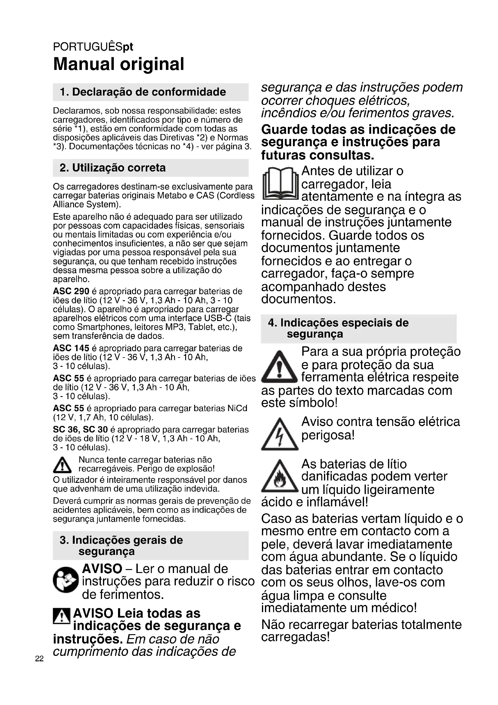 Manual original Declaramos, sob nossa responsabilidade: estes carregadores, identificados por tipo e número de série *1), estão em conformidade com todas as disposições aplicáveis das Diretivas *2) e Normas *3). Documentações técnicas no *4) - ver página 3. Os carregadores destinam-se exclusivamente para carregar baterias originais Metabo e CAS (Cordless Alliance System). Este aparelho não é adequado para ser utilizado por pessoas com capacidades físicas, sensoriais ou mentais limitadas ou com experiência e/ou conhecimentos insuficientes, a não ser que sejam vigiadas por uma pessoa responsável pela sua segurança, ou que tenham recebido instruções dessa mesma pessoa sobre a utilização do aparelho. ASC 290 é apropriado para carregar baterias de iões de lítio (12 V - 36 V, 1,3 Ah - 10 Ah, 3 - 10 células). O aparelho é apropriado para carregar aparelhos elétricos com uma interface USB-C (tais como Smartphones, leitores MP3, Tablet, etc.), sem transferência de dados. ASC 145 é apropriado para carregar baterias de iões de lítio (12 V - 36 V, 1,3 Ah - 10 Ah,