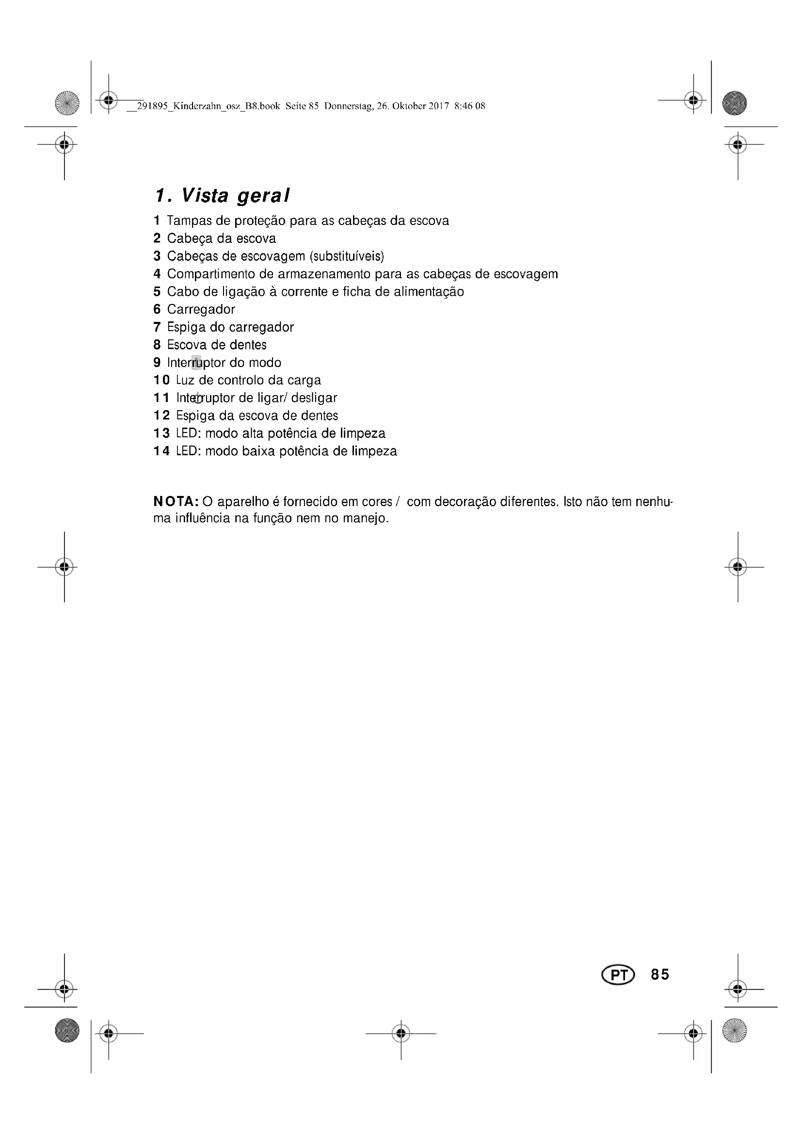 1 Tampas de proteção para as cabeças da escova 2 Cabeça da escova 3 Cabeças de escovagem (substituíveis) 4 Compartimento de armazenamento para as cabeças de escovagem 5 Cabo de ligação à corrente e ficha de alimentação 6 Carregador 7 Espiga do carregador 8 Escova de dentes 9 Interruptor do modo 10 Luz de controlo da carga 11 Interruptor de ligar/desligar 12 Espiga da escova de dentes 13 LED: modo alta potência de limpeza 14 LED: modo baixa potência de limpeza NOTA: O aparelho é fornecido em cores / com decoração diferentes. Isto não tem nenhu- ma influência na função nem no manejo. BBB.LQGHU]DKQBRV]B%ERRN6HLWH'RQQHUVWDJ2NWREHU86