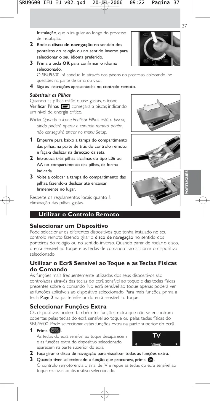 Prima As teclas do ecrã sensível ao toque desaparecem e as funções extra do dispositivo seleccionado aparecem na parte superior do ecrã. Faça girar o disco de navegação para visualizar todas as funções extra. Quando tiver seleccionado a função que procurava, prima O controlo remoto envia o sinal de IV e repõe as teclas do ecrã sensível ao toque relativas ao dispositivo seleccionado. PORTUGUÊS Nota Quando o ícone Verificar Pilhas está a piscar, ainda poderá operar o controlo remoto, porém, não conseguirá entrar no menu Setup. SRU9600_IFU_EU_v02.qxd 20-01-2006 09:22 Pagina 38