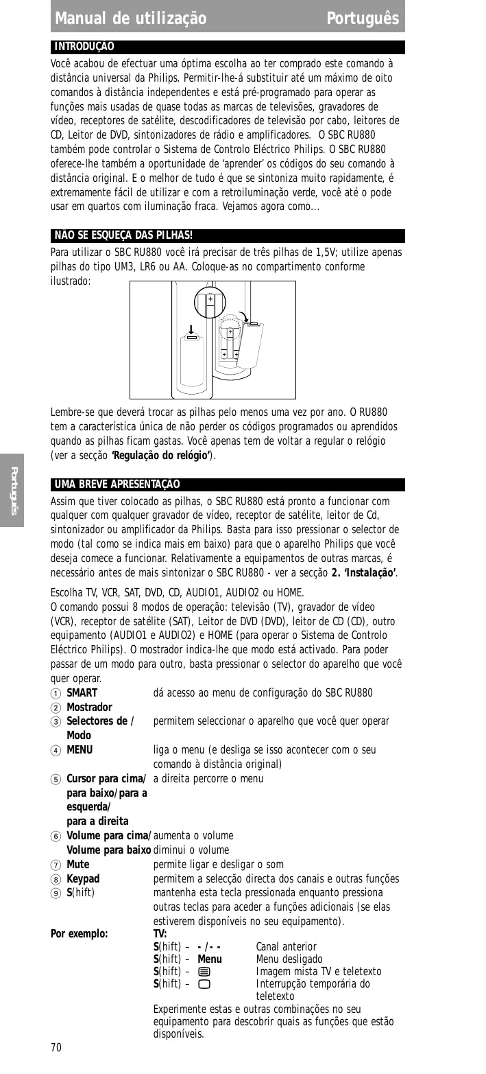 Español CONSEJO: Asegúrese de que el código doméstico que ha seleccionado para el mando a distancia y todos lo interruptores Power es el mismo. Manual de utilização Português INTRODUÇÃO Você acabou de efectuar uma óptima escolha ao ter comprado este comando à distância universal da Philips. Permitir-lhe-á substituir até um máximo de oito comandos à distância independentes e está pré-programado para operar as funções mais usadas de quase todas as marcas de televisões, gravadores de vídeo, receptores de satélite, descodificadores de televisão por cabo, leitores de CD, Leitor de DVD, sintonizadores de rádio e amplificadores. O SBC RU880 também pode controlar o Sistema de Controlo Eléctrico Philips. O SBC RU880 oferece-lhe também a oportunidade de ‘aprender’ os códigos do seu comando à distância original. E o melhor de tudo é que se sintoniza muito rapidamente, é extremamente fácil de utilizar e com a retroiluminação verde, você até o pode usar em quartos com iluminação fraca. Vejamos agora como... NÃO SE ESQUEÇA DAS PILHAS! Para utilizar o SBC RU880 você irá precisar de três pilhas de 1,5V; utilize apenas pilhas do tipo UM3, LR6 ou AA. Coloque-as no compartimento conforme ilustrado: