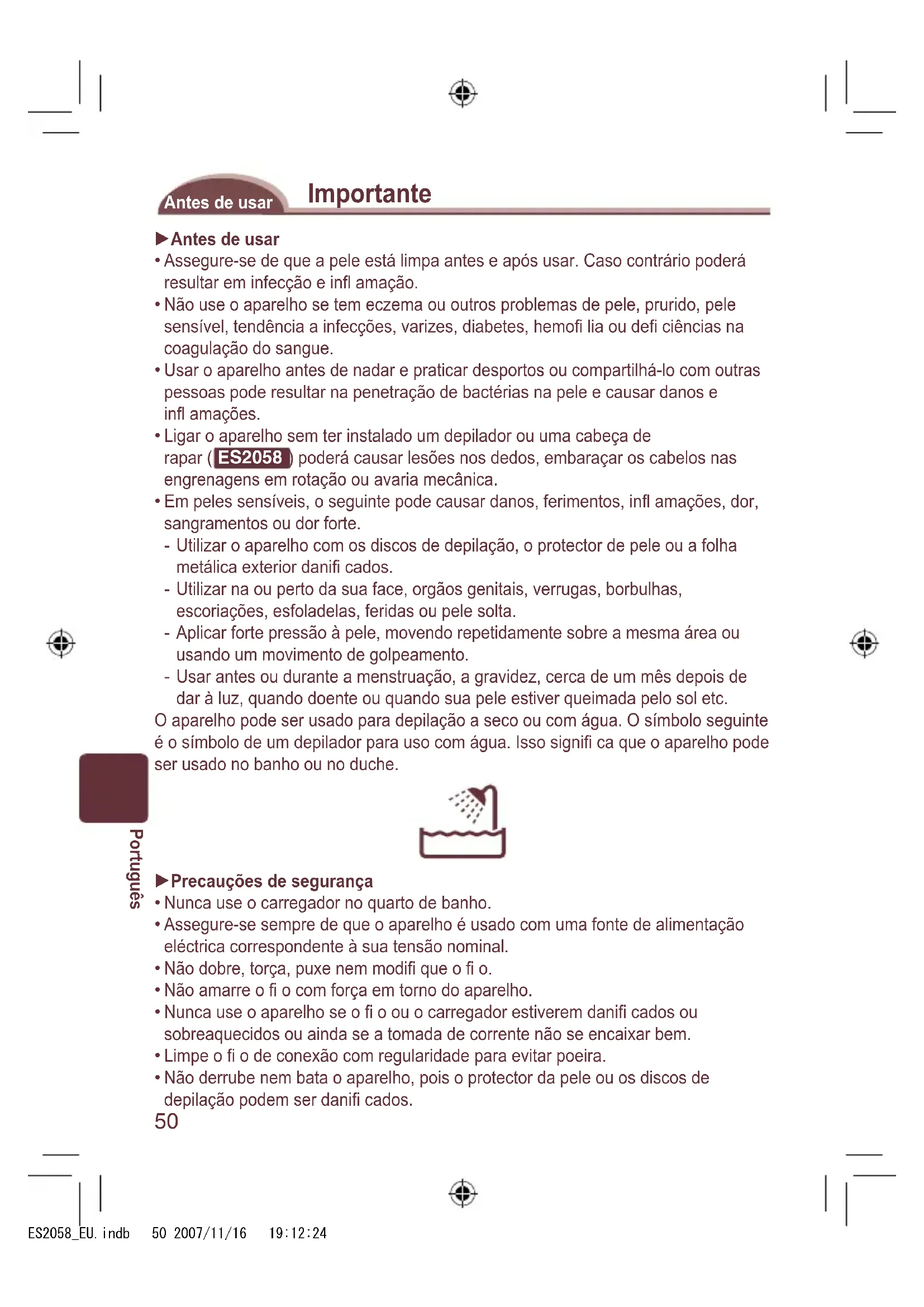 Ontgrendelingsknop van opzetstuk Accessoires: Lader (RE7-44), reinigingsborsteltje en opbergtasje (Gebruik uitsluitend de meegeleverde accessoires.) ES2058_EU.indb 49 2007/11/16 19:12:2350 Português Importante Antes de usar Antes de usar Assegure-se de que a pele está limpa antes e após usar. Caso contrário poderá resultar em infecção e infl amação. Não use o aparelho se tem eczema ou outros problemas de pele, prurido, pele sensível, tendência a infecções, varizes, diabetes, hemofi lia ou defi ciências na coagulação do sangue. Usar o aparelho antes de nadar e praticar desportos ou compartilhá-lo com outras pessoas pode resultar na penetração de bactérias na pele e causar danos e infl amações. Ligar o aparelho sem ter instalado um depilador ou uma cabeça de rapar ( ES2058 ) poderá causar lesões nos dedos, embaraçar os cabelos nas engrenagens em rotação ou avaria mecânica. Em peles sensíveis, o seguinte pode causar danos, ferimentos, infl amações, dor, sangramentos ou dor forte. Utilizar o aparelho com os discos de depilação, o protector de pele ou a folha metálica exterior danifi cados. Utilizar na ou perto da sua face, orgãos genitais, verrugas, borbulhas, escoriações, esfoladelas, feridas ou pele solta. Aplicar forte pressão à pele, movendo repetidamente sobre a mesma área ou usando um movimento de golpeamento. Usar antes ou durante a menstruação, a gravidez, cerca de um mês depois de dar à luz, quando doente ou quando sua pele estiver queimada pelo sol etc. O aparelho pode ser usado para depilação a seco ou com água. O símbolo seguinte é o símbolo de um depilador para uso com água. Isso signifi ca que o aparelho pode ser usado no banho ou no duche. Precauções de segurança Nunca use o carregador no quarto de banho. Assegure-se sempre de que o aparelho é usado com uma fonte de alimentação eléctrica correspondente à sua tensão nominal. Não dobre, torça, puxe nem modifi que o fi o. Não amarre o fi o com força em torno do aparelho. Nunca use o aparelho se o fi o ou o carregador estiverem danifi cados ou sobreaquecidos ou ainda se a tomada de corrente não se encaixar bem. Limpe o fi o de conexão com regularidade para evitar poeira. Não derrube nem bata o aparelho, pois o protector da pele ou os discos de depilação podem ser danifi cados.