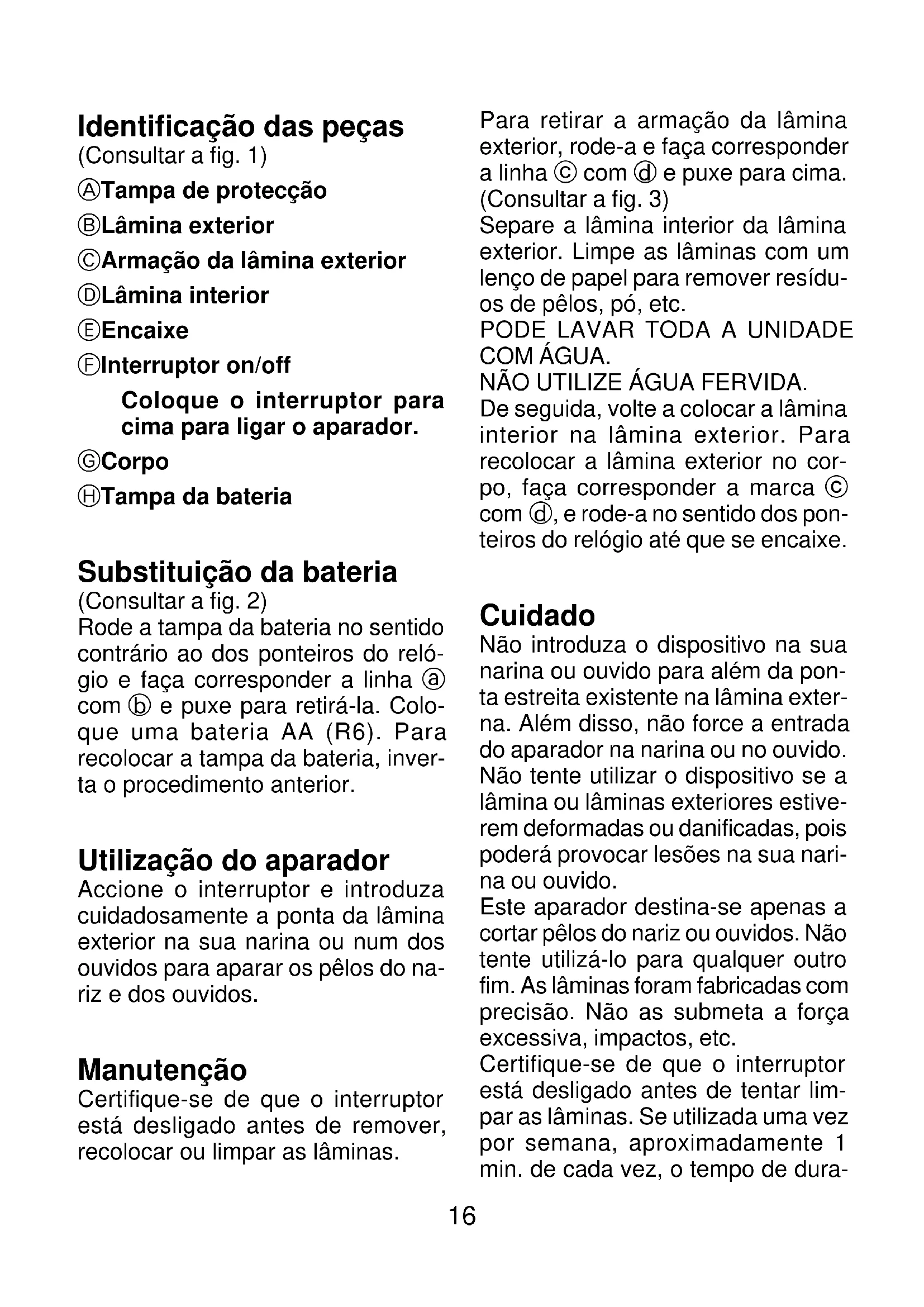 Não introduza o dispositivo na sua narina ou ouvido para além da ponta estreita existente na lâmina externa. Além disso, não force a entrada do aparador na narina ou no ouvido. Não tente utilizar o dispositivo se a lâmina ou lâminas exteriores estive- rem deformadas ou danificadas, pois poderá provocar lesões na sua nari-na ou ouvido.