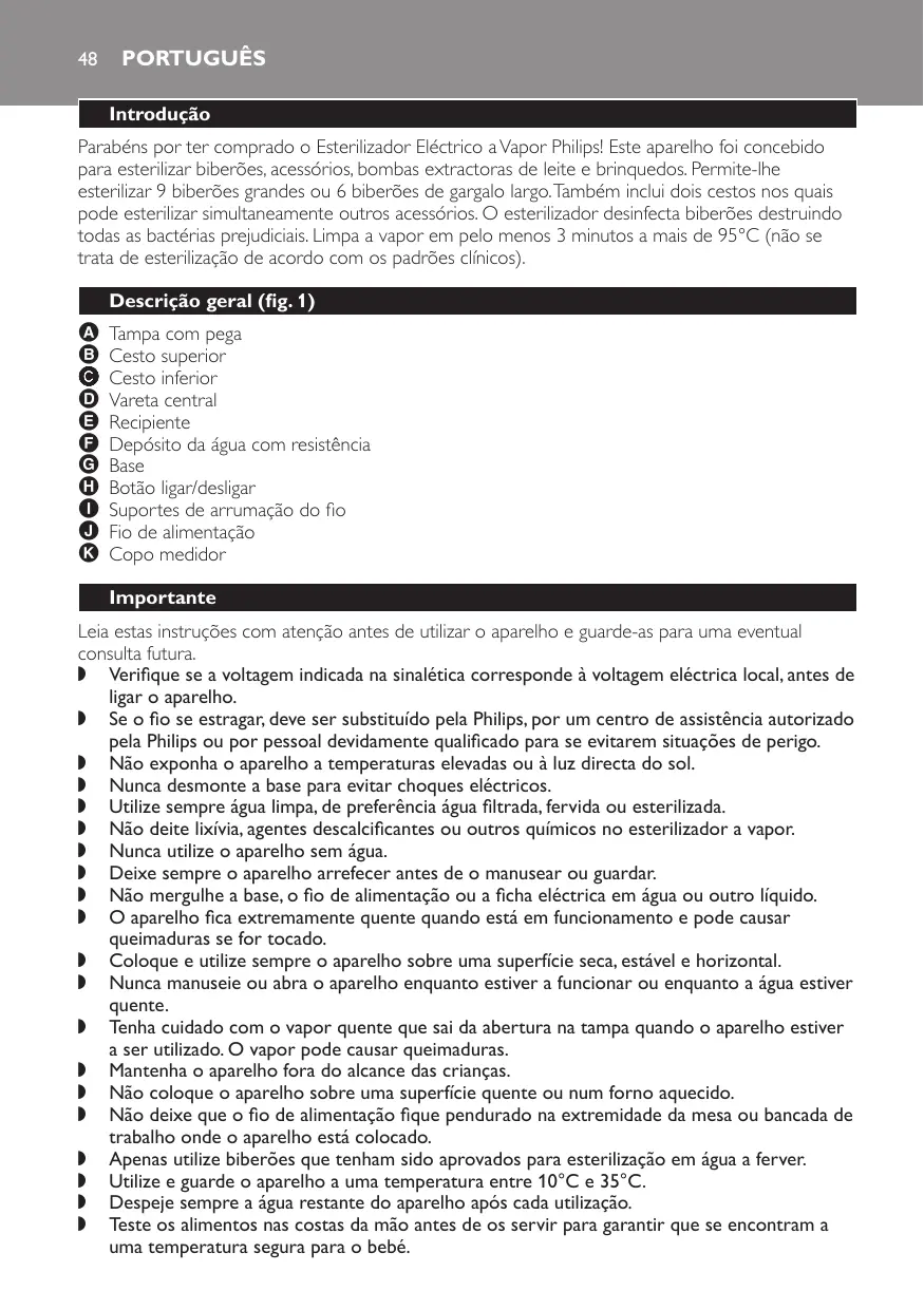 Tampa com pega Cesto superior Cesto inferior Vareta central Recipiente Depósito da água com resistência Base Botão ligar/desligar Suportes de arrumação do fio Fio de alimentação Copo medidor Importante Leia estas instruções com atenção antes de utilizar o aparelho e guarde-as para uma eventual consulta futura. , Verifique se a voltagem indicada na sinalética corresponde à voltagem eléctrica local, antes de ligar o aparelho. , Se o fio se estragar, deve ser substituído pela Philips, por um centro de assistência autorizado pela Philips ou por pessoal devidamente qualificado para se evitarem situações de perigo. , Não exponha o aparelho a temperaturas elevadas ou à luz directa do sol. , Nunca desmonte a base para evitar choques eléctricos. , Utilize sempre água limpa, de preferência água filtrada, fervida ou esterilizada. , Não deite lixívia, agentes descalcificantes ou outros químicos no esterilizador a vapor. , Nunca utilize o aparelho sem água. , Deixe sempre o aparelho arrefecer antes de o manusear ou guardar. , Não mergulhe a base, o fio de alimentação ou a ficha eléctrica em água ou outro líquido. , O aparelho fica extremamente quente quando está em funcionamento e pode causar queimaduras se for tocado. , Coloque e utilize sempre o aparelho sobre uma superfície seca, estável e horizontal. , Nunca manuseie ou abra o aparelho enquanto estiver a funcionar ou enquanto a água estiver quente. , Tenha cuidado com o vapor quente que sai da abertura na tampa quando o aparelho estiver a ser utilizado. O vapor pode causar queimaduras. , Mantenha o aparelho fora do alcance das crianças. , Não coloque o aparelho sobre uma superfície quente ou num forno aquecido. , Não deixe que o fio de alimentação fique pendurado na extremidade da mesa ou bancada de trabalho onde o aparelho está colocado. , Apenas utilize biberões que tenham sido aprovados para esterilização em água a ferver. , Utilize e guarde o aparelho a uma temperatura entre 10°C e 35°C. , Despeje sempre a água restante do aparelho após cada utilização. , Teste os alimentos nas costas da mão antes de os servir para garantir que se encontram a uma temperatura segura para o bebé. Português 49