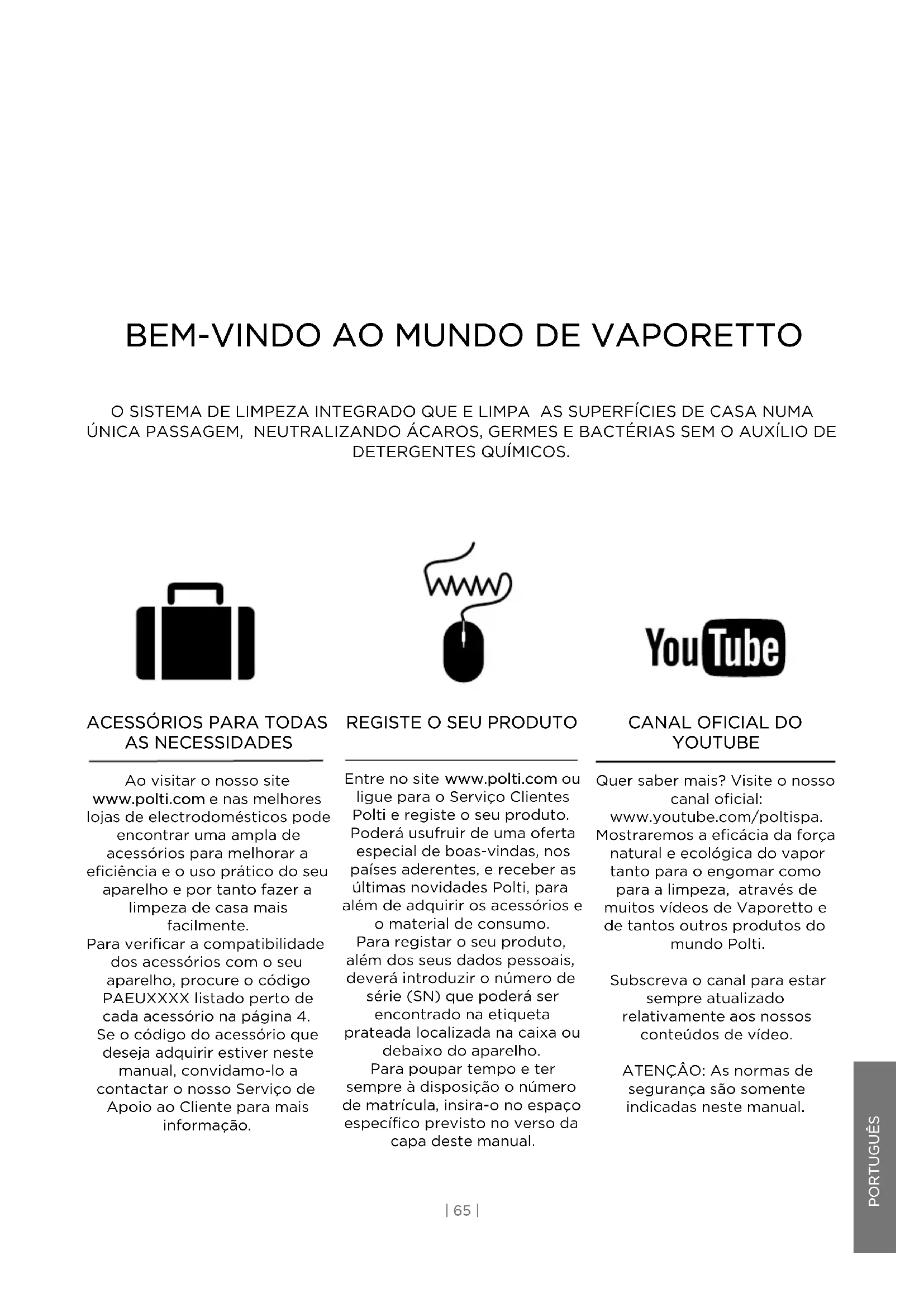YOUTUBE Quer saber mais? Visite o nosso canal oficial: www.youtube.com/poltispa. Mostraremos a eficácia da força natural e ecológica do vapor tanto para o engomar como para a limpeza, através de muitos vídeos de Vaporetto e de tantos outros produtos do mundo Polti. Subscreva o canal para estar sempre atualizado relativamente aos nossos conteúdos de vídeo. ATENÇÂO: As normas de segurança são somente indicadas neste manual.| 66 |
