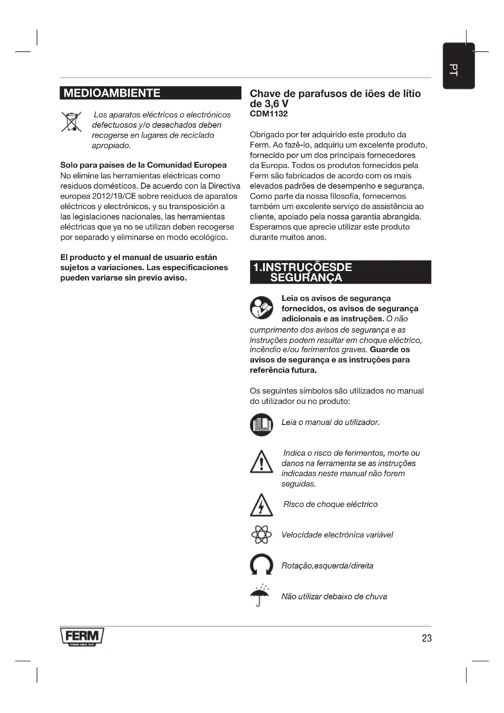 AMBIENTE Os aparelhos eléctricos ou electrónicos defeituosos e/ou eliminados devem ser recolhidos em locais de reciclagem adequados. Apenas para os países da CE Não elimine as ferramentas eléctricas em conjunto com os resíduos domésticos. De acordo com a directiva europeia 2012/19/EC sobre resíduos de equipamentos eléctricos e electrónicos e a respectiva implementação na legislação nacional, as ferramentas eléctricas que já não sejam utilizadas devem ser recolhidas em separado e eliminadas de maneira ecológica. O equipamento e o manual do utilizador estão sujeitos a alterações sem aviso prévio. As especificações podem ser alteradas sem aviso prévio. Trapano/avvitatore con batteria Li-Ion 3,6 V CDM1132 Grazie per avere acquistato questo prodotto Ferm. Ora possiedi un prodotto eccellente, offerto da uno dei principali fornitori europei. Tutti i prodotti Ferm sono realizzati nel rispetto dei più rigorosi standard prestazionali e di sicurezza. Quale parte della nostra filosofia offriamo inoltre un servizio di assistenza ai clienti eccellente, supportato da una garanzia completa. Ci auguriamo che possiate utilizzare con soddisfazione questo prodotto per molti anni.