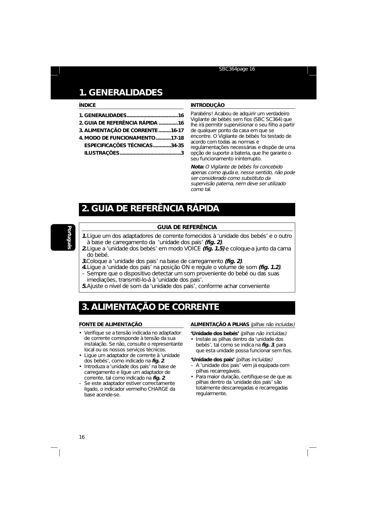 ILUSTRAÇÕES............................................3 Parabéns! Acabou de adquirir um verdadeiro Vigilante de bébés sem fios (SBC SC364) que lhe irá permitir supervisionar o seu filho a partir de qualquer ponto da casa em que se encontre. O Vigilante de bébés foi testado de acordo com todas as normas e regulamentações necessárias e dispõe de uma opção de suporte a bateria, que lhe garante o seu funcionamento ininterrupto. Nota: O Vigilante de bébés foi concebido apenas como ajuda e, nesse sentido, não pode ser considerado como substituto da supervisão paterna, nem deve ser utilizado como tal.