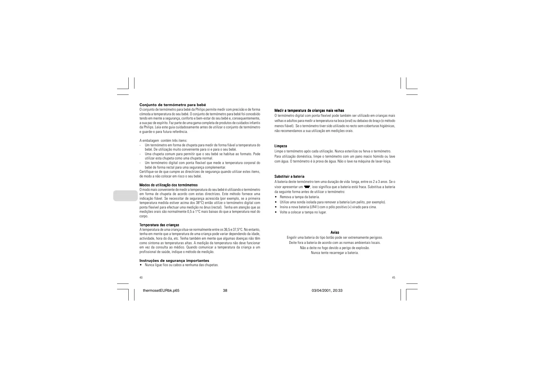 03/04/2001, 20:33 Conjunto de termómetro para bebé O conjunto de termómetro para bebé da Philips permite medir com precisão e de forma cómoda a temperatura do seu bebé. O conjunto de termómetro para bebé foi concebido tendo em mente a segurança, conforto e bem-estar do seu bebé e, consequentemente, a sua paz de espírito. Faz parte de uma gama completa de produtos de cuidados infantis da Philips. Leia este guia cuidadosamente antes de utilizar o conjunto de termómetro e guarde-o para futura referência. A embalagem contém três items: - Um termómetro em forma de chupeta para medir de forma fiável a temperatura do bebé. De utilização muito conveniente para si e para o seu bebé. - Uma chupeta comum para permitir que o seu bebé se habitue ao formato. Pode utilizar esta chupeta como uma chupeta normal. - Um termómetro digital com ponta flexível que mede a temperatura corporal do bebé de forma rectal para uma segurança complementar. Certifique-se de que cumpre as directrizes de segurança quando utilizar estes items, de modo a não colocar em risco o seu bebé. Modos de utilização dos ter mómetr termómetr mómetros O modo mais conveniente de medir a temperatura do seu bebé é utilizando o termómetro em forma de chupeta de acordo com estas directrizes. Este método fornece uma indicação fiável. Se necessitar de segurança acrescida (por exemplo, se a primeira temperatura medida estiver acima dos 38°C) então utilize o termómetro digital com ponta flexível para efectuar uma medição no ânus (rectal). Tenha em atenção que as medições orais são normalmente 0,5 a 1°C mais baixas do que a temperatura real do corpo. Temperatura das crianças A temperatura de uma criança situa-se normalmente entre os 36,5 e 37,5°C. No entanto, tenha em mente que a temperatura de uma criança pode variar dependendo da idade, actividade, hora do dia, etc. Tenha também em mente que algumas doenças não têm como sintoma as temperaturas altas. A medição da temperatura não deve funcionar em vez da consulta ao médico. Quando comunicar a temperatura da criança a um profissional de saúde, indique o método de medição. Medir a temperatura de crianças mais velhas O termómetro digital com ponta flexível pode também ser utilizado em crianças mais velhas e adultos para medir a temperatura na boca (oral) ou debaixo do braço (o método menos fiável). Se o termómetro tiver sido utilizado no recto sem coberturas higiénicas, não recomendamos a sua utilização em medições orais. Limpeza Limpe o termómetro após cada utilização. Nunca esterilize ou ferva o termómetro. Para utilização doméstica, limpe o termómetro com um pano macio húmido ou lave com água. O termómetro é à prova de água. Não o lave na máquina de lavar-loiça. Substituir a bateria A bateria deste termómetro tem uma duração de vida longa, entre os 2 a 3 anos. Se o visor apresentar um , isso significa que a bateria está fraca. Substitua a bateria da seguinte forma antes de utilizar o termómetro: