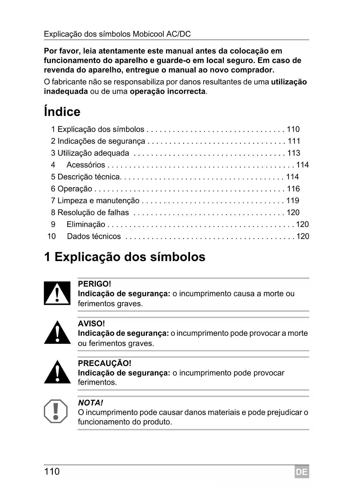 NOTA! O incumprimento pode causar danos materiais e pode prejudicar o funcionamento do produto.DE Mobicool AC/DC Indicações de segurança