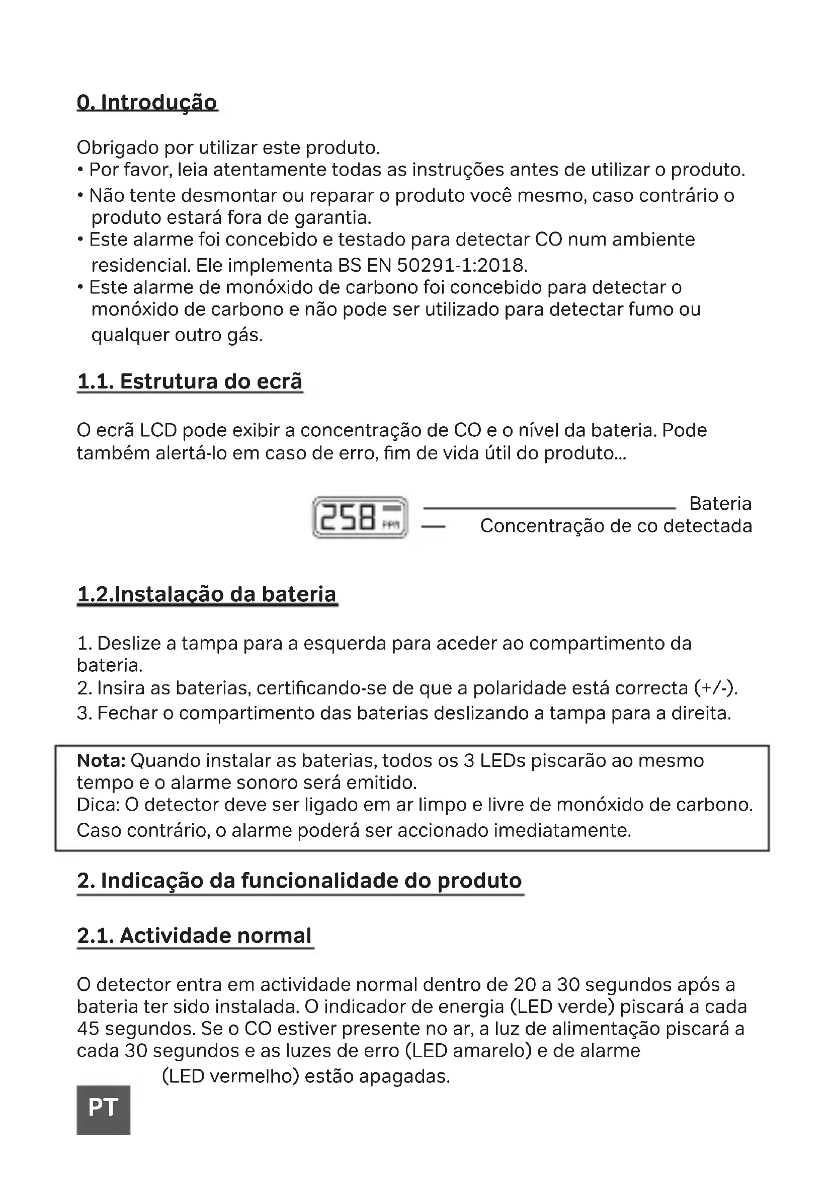 Nota: Quando instalar as baterias, todos os 3 LEDs piscarão ao mesmo tempo e o alarme sonoro será emitido. Dica: O detector deve ser ligado em ar limpo e livre de monóxido de carbono. Caso contrário, o alarme poderá ser accionado imediatamente.