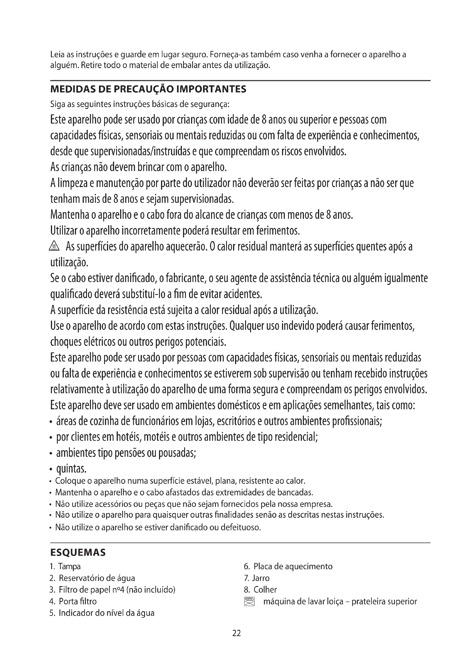Siga as seguintes instruções básicas de segurança: Este aparelho pode ser usado por crianças com idade de 8 anos ou superior e pessoas com capacidades físicas, sensoriais ou mentais reduzidas ou com falta de experiência e conhecimentos, desde que supervisionadas/instruídas e que compreendam os riscos envolvidos. As crianças não devem brincar com o aparelho. A limpeza e manutenção por parte do utilizador não deverão ser feitas por crianças a não ser que tenham mais de 8 anos e sejam supervisionadas. Mantenha o aparelho e o cabo fora do alcance de crianças com menos de 8 anos. Utilizar o aparelho incorretamente poderá resultar em ferimentos. h As superfícies do aparelho aquecerão. O calor residual manterá as superfícies quentes após a utilização. Se o cabo estiver danicado, o fabricante, o seu agente de assistência técnica ou alguém igualmente qualicado deverá substituí-lo a m de evitar acidentes. A superfície da resistência está sujeita a calor residual após a utilização. Use o aparelho de acordo com estas instruções. Qualquer uso indevido poderá causar ferimentos, choques elétricos ou outros perigos potenciais. Este aparelho pode ser usado por pessoas com capacidades físicas, sensoriais ou mentais reduzidas ou falta de experiência e conhecimentos se estiverem sob supervisão ou tenham recebido instruções relativamente à utilização do aparelho de uma forma segura e compreendam os perigos envolvidos. Este aparelho deve ser usado em ambientes domésticos e em aplicações semelhantes, tais como: