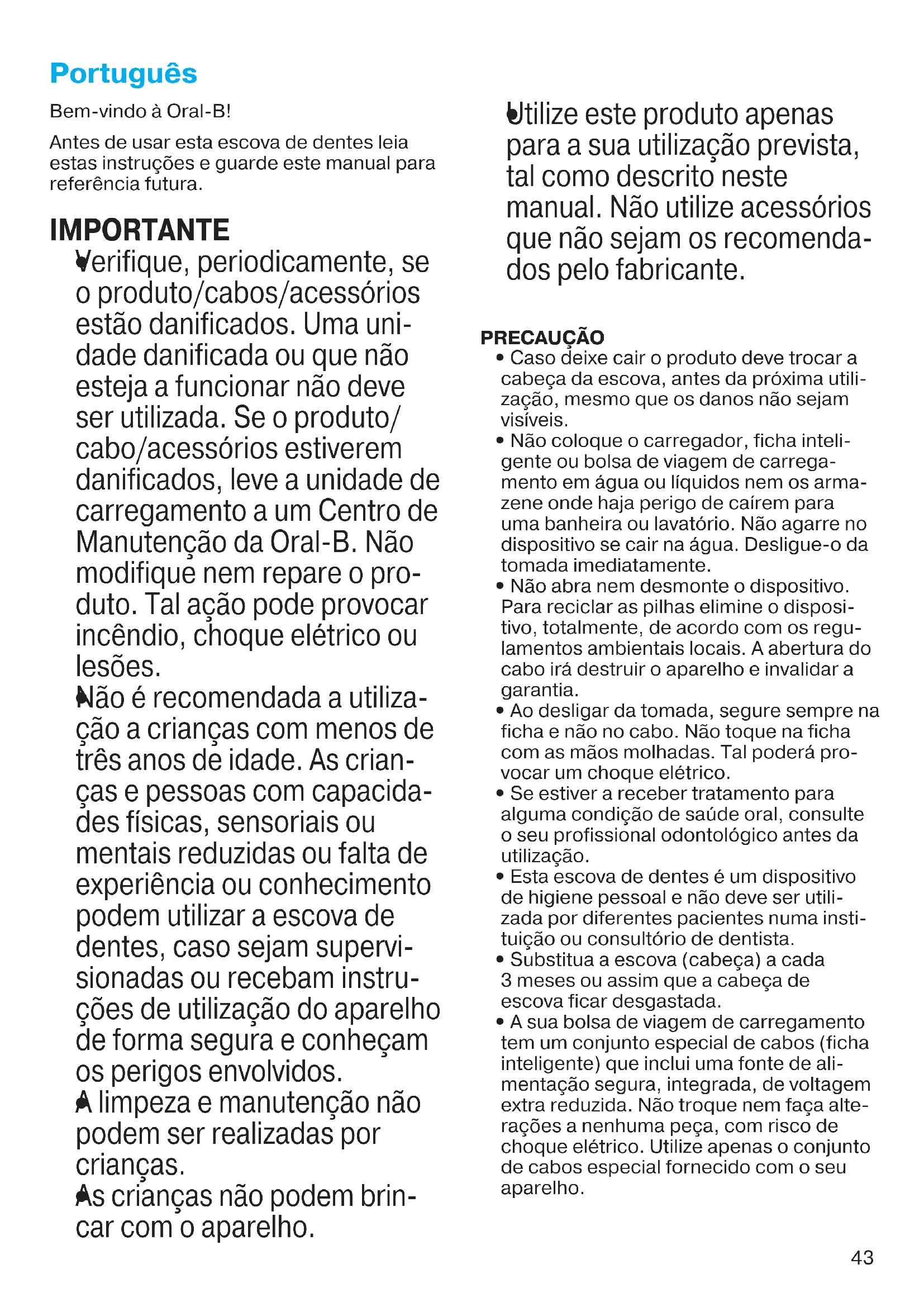 Verifique, periodicamente, se o produto/cabos/acessórios estão danificados. Uma uni- dade danificada ou que não esteja a funcionar não deve ser utilizada. Se o produto/ cabo/acessórios estiverem danificados, leve a unidade de carregamento a um Centro de Manutenção da Oral-B. Não modifique nem repare o pro- duto. Tal ação pode provocar incêndio, choque elétrico ou lesões.