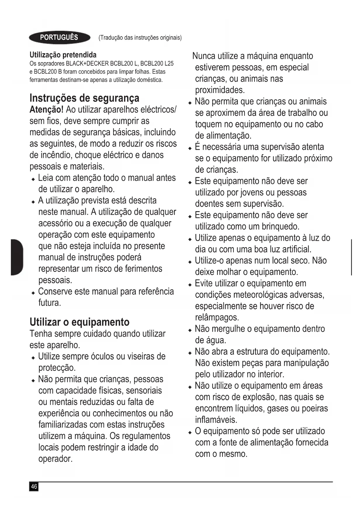 (potencia acústica garantizada) 91 dB(A) Estos productos también cumplen las directivas 2014/30/UE y 2011/65/UE. Para más información, póngase en contacto con Black & Decker en la siguiente dirección o consulte la parte posterior del manual. El abajo rmante es el responsable de la compilación del archivo técnico y realiza esta declaración en representación de Black & Decker. R. Laverick Director de Ingeniería Black & Decker Europe, 210 Bath Road, Slough, Berkshire, SL1 3YD Reino Unido 21/08/2018 Garantía Black & Decker confía en la calidad de sus productos y ofrece a los consumidores una garantía de 24 meses a partir de la fecha de compra. Esta garantía es adicional a sus derechos legales y no los menoscaba en modo alguno. La garantía es válida dentro de los territorios de los Estados Miembros de la Unión Europea y del Área de Libre Comercio Europea. Para reclamar la garantía, la reclamación se debe presentar de conformidad con las condiciones de Black & Decker. Tendrá que adjuntar un justicante de compra al vendedor o al agente técnico autorizado. Las condiciones de la garantía de 2 años de Black & Decker y la ubicación de su agente técnico autorizado más cercano se pueden obtener en Internet en www.2helpU.com o poniéndose en contacto con su ocina local de Black & Decker en la dirección que se indica en este manual. Visite nuestro sitio web www.blackanddecker.co.uk para registrar su nuevo producto Black & Decker y recibir noticias sobre nuevos productos y ofertas especiales.46 (Tradução das instruções originais) PORTUGUÊS Utilização pretendida Os sopradores BLACK+DECKER BCBL200 L, BCBL200 L25 e BCBL200 B foram concebidos para limpar folhas. Estas ferramentas destinam-se apenas a utilização doméstica. Instruções de segurança Atenção! Ao utilizar aparelhos eléctricos/ sem os, deve sempre cumprir as medidas de segurança básicas, incluindo as seguintes, de modo a reduzir os riscos de incêndio, choque eléctrico e danos pessoais e materiais. u Leia com atenção todo o manual antes de utilizar o aparelho. u A utilização prevista está descrita neste manual. A utilização de qualquer acessório ou a execução de qualquer operação com este equipamento que não esteja incluída no presente manual de instruções poderá representar um risco de ferimentos pessoais. u Conserve este manual para referência futura. Utilizar o equipamento Tenha sempre cuidado quando utilizar este aparelho. u Utilize sempre óculos ou viseiras de protecção. u Não permita que crianças, pessoas com capacidade físicas, sensoriais ou mentais reduzidas ou falta de experiência ou conhecimentos ou não familiarizadas com estas instruções utilizem a máquina. Os regulamentos locais podem restringir a idade do operador. Nunca utilize a máquina enquanto estiverem pessoas, em especial crianças, ou animais nas proximidades. u Não permita que crianças ou animais se aproximem da área de trabalho ou toquem no equipamento ou no cabo de alimentação. u É necessária uma supervisão atenta se o equipamento for utilizado próximo de crianças. u Este equipamento não deve ser utilizado por jovens ou pessoas doentes sem supervisão. u Este equipamento não deve ser utilizado como um brinquedo. u Utilize apenas o equipamento à luz do dia ou com uma boa luz articial. u Utilize-o apenas num local seco. Não deixe molhar o equipamento. u Evite utilizar o equipamento em condições meteorológicas adversas, especialmente se houver risco de relâmpagos. u Não mergulhe o equipamento dentro de água. u Não abra a estrutura do equipamento. Não existem peças para manipulação pelo utilizador no interior. u Não utilize o equipamento em áreas com risco de explosão, nas quais se encontrem líquidos, gases ou poeiras inamáveis. u O equipamento só pode ser utilizado com a fonte de alimentação fornecida com o mesmo.47 (Tradução das instruções originais) PORTUGUÊS Riscos residuais. Podem surgir riscos residuais adicionais durante a utilização da ferramenta, que poderão não constar nos avisos de segurança incluídos. Estes riscos podem resultar de má utilização, uso prolongado, etc. Mesmo com o cumprimento dos regulamentos de segurança relevantes e com a implementação de dispositivos de segurança, alguns riscos residuais não podem ser evitados. Estes incluem: u Ferimentos causados pelo contacto com peças em rotação/movimento. u Ferimentos causados durante a substituição de peças, lâminas ou acessórios. u Ferimentos causados pela utilização prolongada de uma ferramenta. Se utilizar uma ferramenta durante períodos prolongados, certique-se de que faz pausas regularmente. u Danos auditivos. u Problemas de saúde causados pela inalação de poeiras resultantes da utilização da ferramenta (exemplo: trabalhos em madeira, especialmente carvalho, faia e MDF). Após a utilização u Quando não for utilizado, o equipamento deve ser guardado num local seco e com boa ventilação, fora do alcance das crianças. u As crianças não devem ter acesso a equipamentos armazenados. u Se o equipamento for guardado ou transportado num veículo, deve ser colocado na bagageira ou xado para evitar qualquer movimento devido a alterações súbitas na velocidade ou direcção. Inspecção e reparações u Antes da utilização verique se há peças danicadas ou avariadas no equipamento. Verique se existem peças partidas e quaisquer outras situações que possam afectar o bom funcionamento. u Não utilize este equipamento se alguma das peças estiver danicada ou avariada. u Mande reparar ou substituir quaisquer peças danicadas ou avariadas por um agente de reparação autorizado. u Nunca tente retirar ou substituir quaisquer peças que não sejam as especicadas neste manual. Instruções de segurança adicionais para sopradores A utilização prevista para este equipamento está descrita no manual. A utilização de qualquer acessório ou a realização de qualquer o