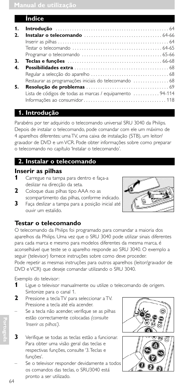 Parabéns por ter adquirido o telecomando universal SRU 3040 da Philips. Depois de instalar o telecomando, pode comandar com ele um máximo de 4 aparelhos diferentes: uma TV, uma caixa de instalação (STB), um leitor/ gravador de DVD e um VCR. Pode obter informações sobre como preparar o telecomando no capítulo ‘Instalar o telecomando’.