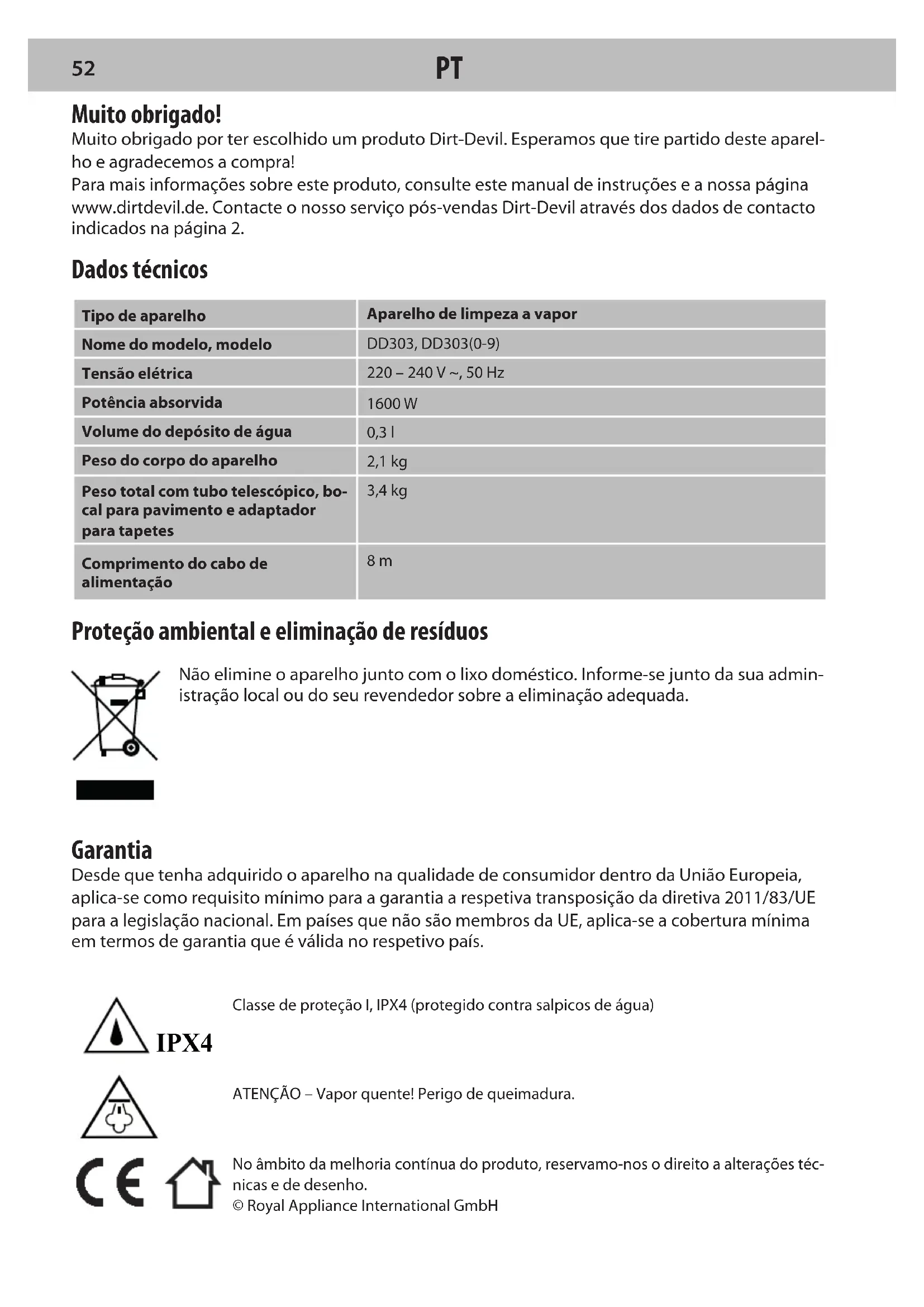 51IPX4 Proteção ambiental e eliminação de resíduos Não elimine o aparelho junto com o lixo doméstico. Informe-se junto da sua admin- istração local ou do seu revendedor sobre a eliminação adequada. Garantia Desde que tenha adquirido o aparelho na qualidade de consumidor dentro da União Europeia, aplica-se como requisito mínimo para a garantia a respetiva transposição da diretiva 2011/83/UE para a legislação nacional. Em países que não são membros da UE, aplica-se a cobertura mínima em termos de garantia que é válida no respetivo país. No âmbito da melhoria contínua do produto, reservamo-nos o direito a alterações téc-nicas e de desenho.© Royal Appliance International GmbH Muito obrigado! Muito obrigado por ter escolhido um produto Dirt-Devil. Esperamos que tire partido deste aparel- ho e agradecemos a compra! Para mais informações sobre este produto, consulte este manual de instruções e a nossa página www.dirtdevil.de. Contacte o nosso serviço pós-vendas Dirt-Devil através dos dados de contacto indicados na página 2. Dados técnicos Tipo de aparelhoAparelho de limpeza a vaporNome do modelo, modeloDD303, DD303(0-9)Tensão elétrica220 – 240 V ~, 50 HzPotência absorvida1600 WVolume do depósito de água0,3 lPeso do corpo do aparelho2,1 kgPeso total com tubo telescópico, bo-cal para pavimento e adaptador para tapetes3,4 kgComprimento do cabo de alimentação 8 m ATENÇÃO – Vapor quente! Perigo de queimadura.Classe de proteçãoI, IPX4 (protegido contra salpicos de água)
