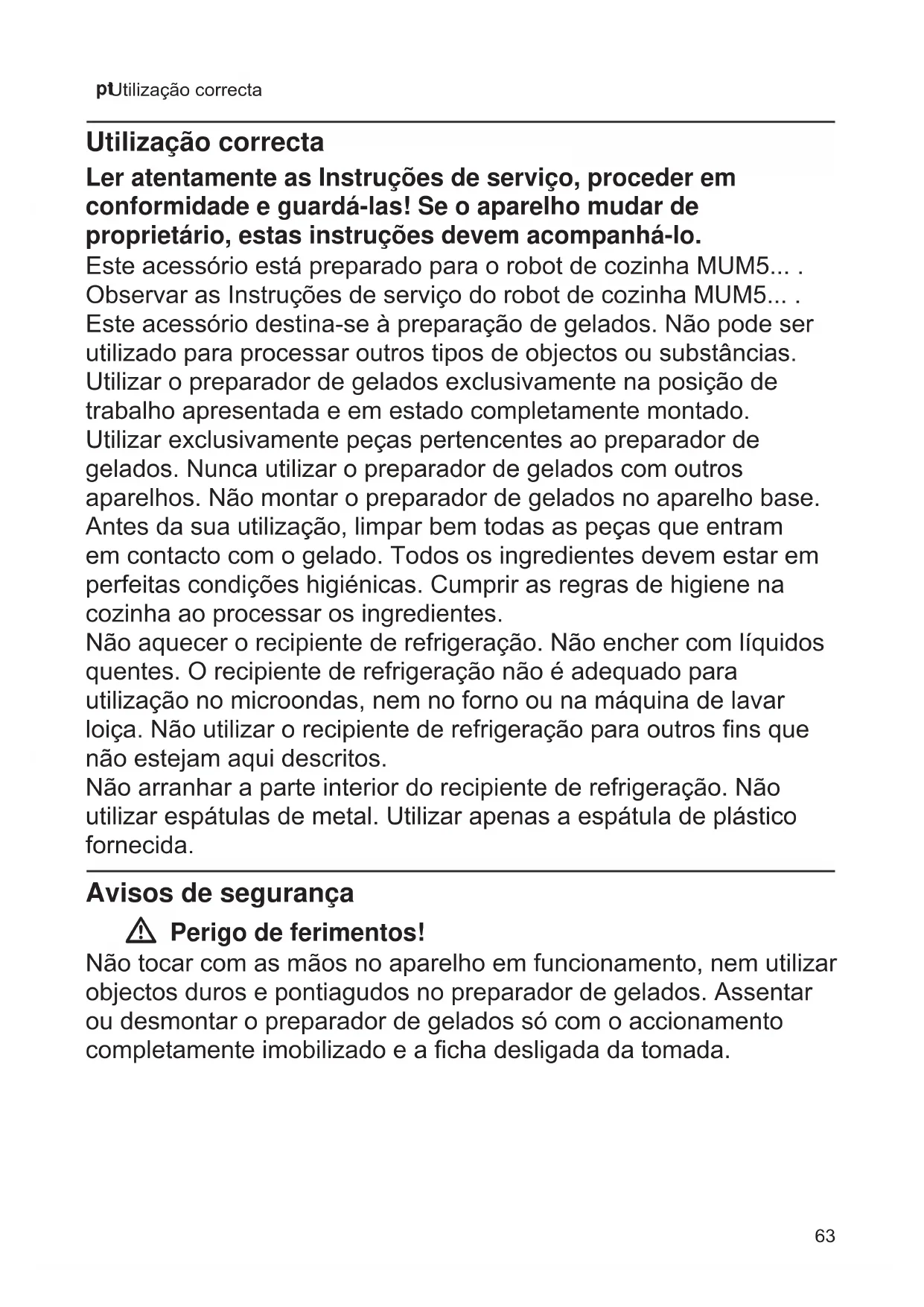 Utilização correcta Utilização correcta Ler atentamente as Instruções de serviço, proceder em conformidade e guardá-las! Se o aparelho mudar de proprietário, estas instruções devem acompanhá-lo. Este acessório está preparado para o robot de cozinha MUM5... . Observar as Instruções de serviço do robot de cozinha MUM5... . Este acessório destina-se à preparação de gelados. Não pode ser utilizado para processar outros tipos de objectos ou substâncias. Utilizar o preparador de gelados exclusivamente na posição de trabalho apresentada e em estado completamente montado. Utilizar exclusivamente peças pertencentes ao preparador de gelados. Nunca utilizar o preparador de gelados com outros aparelhos. Não montar o preparador de gelados no aparelho base. Antes da sua utilização, limpar bem todas as peças que entram em contacto com o gelado. Todos os ingredientes devem estar em perfeitas condições higiénicas. Cumprir as regras de higiene na cozinha ao processar os ingredientes. Não aquecer o recipiente de refrigeração. Não encher com líquidos quentes. O recipiente de refrigeração não é adequado para utilização no microondas, nem no forno ou na máquina de lavar loiça. Não utilizar o recipiente de refrigeração para outros ns que não estejam aqui descritos. Não arranhar a parte interior do recipiente de refrigeração. Não utilizar espátulas de metal. Utilizar apenas a espátula de plástico fornecida. Avisos de segurança W Perigo de ferimentos! Não tocar com as mãos no aparelho em funcionamento, nem utilizar objectos duros e pontiagudos no preparador de gelados. Assentar ou desmontar o preparador de gelados só com o accionamento completamente imobilizado e a cha desligada da tomada.64 pt Panorâmica do aparelho Panorâmica do aparelho Desdobre as páginas com as ilustrações! X Fig. A 1 Tampa do aparelho a Marcações 2 Mecanismo de mexer com acoplamento a Pinos do arrastador 3 Recipiente de refrigeração 4 Base do recipiente de refrigeração 5 Espátula de plástico Protecção contra sobrecarga O mecanismo de mexer dispõe de um acoplamento para evitar danos maiores no seu aparelho, em caso de sobrecarga do preparador de gelados. Se o mecanismo de mexer bloquear durante o funcionamento do aparelho, ouvirá um estalido. Desligue imediatamente o aparelho! Certique-se de que as quantidades indi- cadas nas receitas não foram excedidas. Caso necessário, retire uma parte da massa crua e ligue novamente o aparelho. Indicação: Um estalido do mecanismo de mexer antes de o tempo de confecção indicado terminar é sinal de que o gelado cou pronto mais cedo. Antes da primeira utilização Antes de poder utilizar o acessório, tem de o desembalar por completo, limpar e testar. Atenção! Nunca coloque um acessório em funciona- mento caso se encontre danicado! ■ Retire da embalagem todos os acessórios. ■ Remova o material de embalagem existente. ■ Desmonte as peças montadas nas res- petivas peças individuais. Neste caso, proceda na sequência contrária à da sequência descrita em “Preparação”. ■ Verique se foram fornecidas todas as peças. X Fig. A ■ Verique se as peças apresentam danos visíveis. ■ Antes da primeira utilização, limpe bem e seque todas as peças. X“Conserva- çãoelimpezadiária”verpágina66 Preparação Arrefecer o preparador de gelados Atenção! O recipiente de refrigeração deve estar perfeitamente limpo para ser utilizado na preparação de gelados. X Sequência de imagens B