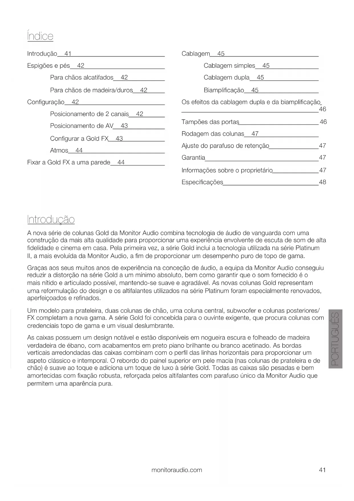 No disp. No disp. Peso (cada uno) 9,12 kg 20 lb 2 oz 21,86 kg 48 lb 2 oz 30,56 kg 67 lb 4 oz 14,48 kg 31 lb 14 oz 6,2 kg 13 lb 10 oz Acabados Piano negro, piano ébano, blanco satinado, nogal oscuro Especificaciones Gold Series40Índice Introdução A nova série de colunas Gold da Monitor Audio combina tecnologia de áudio de vanguarda com uma construção da mais alta qualidade para proporcionar uma experiência envolvente de escuta de som de alta fidelidade e cinema em casa. Pela primeira vez, a série Gold inclui a tecnologia utilizada na série Platinum II, a mais evoluída da Monitor Audio, a fim de proporcionar um desempenho puro de topo de gama. Graças aos seus muitos anos de experiência na conceção de áudio, a equipa da Monitor Audio conseguiu reduzir a distorção na série Gold a um mínimo absoluto, bem como garantir que o som fornecido é o mais nítido e articulado possível, mantendo-se suave e agradável. As novas colunas Gold representam uma reformulação do design e os altifalantes utilizados na série Platinum foram especialmente renovados, aperfeiçoados e refinados. Um modelo para prateleira, duas colunas de chão, uma coluna central, subwoofer e colunas posteriores/ FX completam a nova gama. A série Gold foi concebida para o ouvinte exigente, que procura colunas com credenciais topo de gama e um visual deslumbrante. As caixas possuem um design notável e estão disponíveis em nogueira escura e folheado de madeira verdadeira de ébano, com acabamentos em preto piano brilhante ou branco acetinado. As bordas verticais arredondadas das caixas combinam com o perfil das linhas horizontais para proporcionar um aspeto clássico e intemporal. O rebordo do painel superior em pele macia (nas colunas de prateleira e de chão) é suave ao toque e adiciona um toque de luxo à série Gold. Todas as caixas são pesadas e bem amortecidas com fixação robusta, reforçada pelos altifalantes com parafuso único da Monitor Audio que permitem uma aparência pura. Introdução 41 Espigões e pés 42 Para chãos alcatifados 42 Para chãos de madeira/duros 42 Configuração 42 Posicionamento de 2 canais 42 Posicionamento de AV 43 Configurar a Gold FX 43 Atmos 44 Fixar a Gold FX a uma parede 44 Cablagem 45 Cablagem simples 45 Cablagem dupla 45 Biamplificação 45 Os efeitos da cablagem dupla e da biamplificação