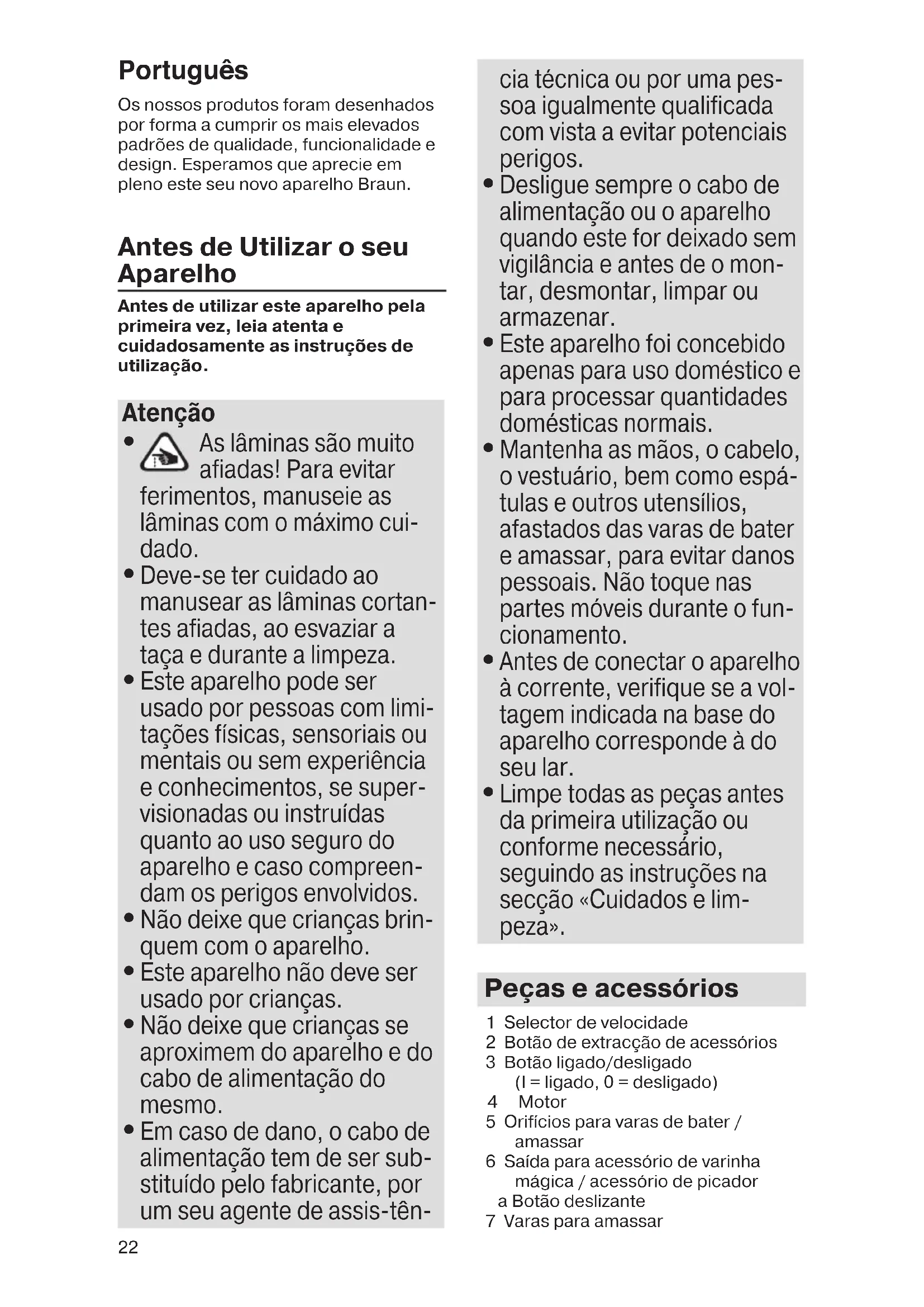 Mantenha as mãos, o cabelo, o vestuário, bem como espá- tulas e outros utensílios, afastados das varas de bater e amassar, para evitar danos pessoais. Não toque nas partes móveis durante o fun- cionamento.