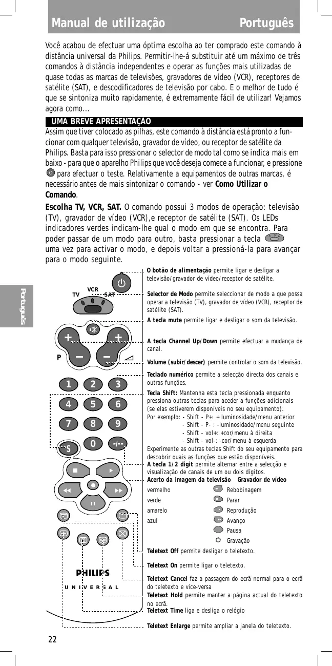 Você acabou de efectuar uma óptima escolha ao ter comprado este comando à distância universal da Philips. Permitir-lhe-á substituir até um máximo de três comandos à distância independentes e operar as funções mais utilizadas de quase todas as marcas de televisões, gravadores de vídeo (VCR), receptores de satélite (SAT), e descodificadores de televisão por cabo. E o melhor de tudo é que se sintoniza muito rapidamente, é extremamente fácil de utilizar! Vejamos agora como... UMA BREVE APRESENTAÇÃO Assim que tiver colocado as pilhas, este comando à distância está pronto a funcionar com qualquer televisão, gravador de vídeo, ou receptor de satélite da Philips. Basta para isso pressionar o selector de modo tal como se indica mais em baixo - para que o aparelho Philips que você deseja comece a funcionar, e pressione para efectuar o teste. Relativamente a equipamentos de outras marcas, é necessário antes de mais sintonizar o comando - ver Como Utilizar o Comando. Escolha TV, VCR, SAT. O comando possui 3 modos de operação: televisão (TV), gravador de vídeo (VCR),e receptor de satélite (SAT). Os LEDs indicadores verdes indicam-lhe qual o modo em que se encontra. Para poder passar de um modo para outro, basta pressionar a tecla uma vez para activar o modo, e depois voltar a pressioná-la para avançar para o modo seguinte. O botão de alimentação permite ligar e desligar a televisão/gravador de vídeo/receptor de satélite.