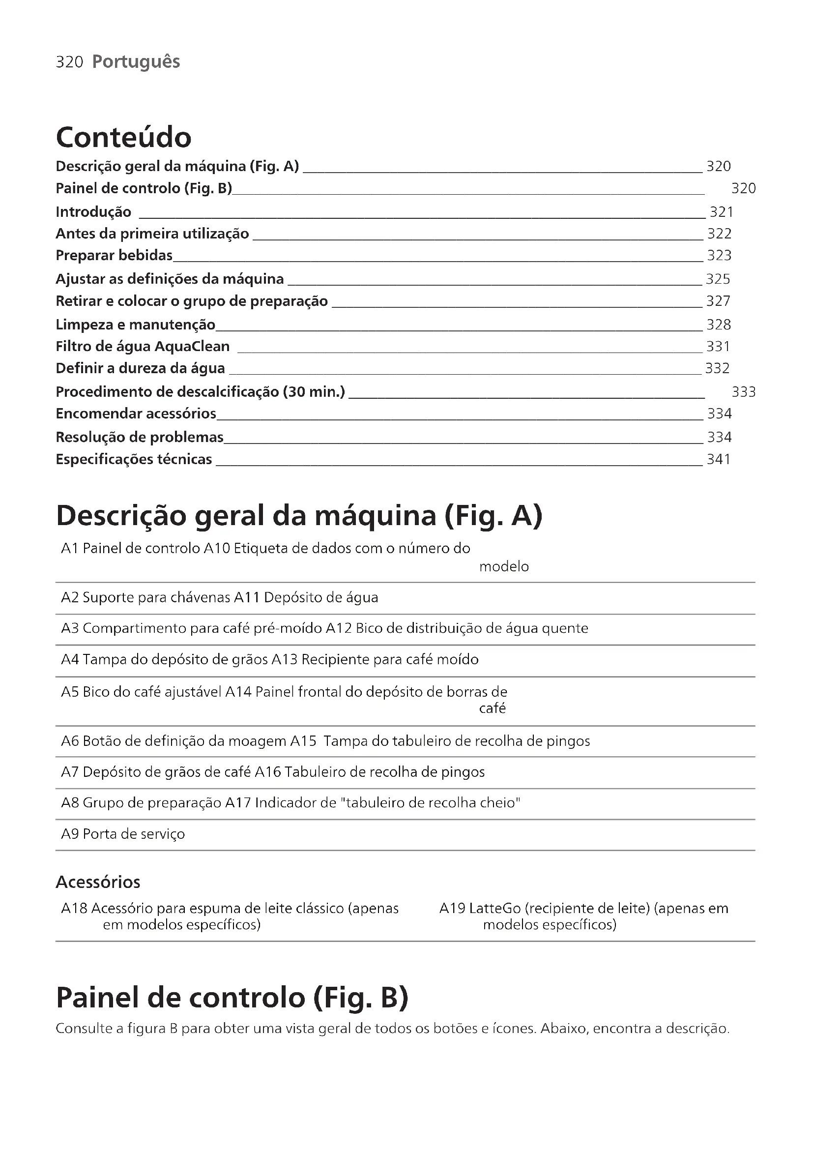 Português Português Conteúdo Descrição geral da máquina (Fig. A) _______________________________________________________ 320 Painel de controlo (Fig. B)_________________________________________________________________ 320 Introdução ______________________________________________________________________________ 321Antes da primeira utilização ______________________________________________________________ 322Preparar bebidas_________________________________________________________________________ 323Ajustar as definições da máquina _________________________________________________________ 325Retirar e colocar o grupo de preparação ___________________________________________________ 327Limpeza e manutenção___________________________________________________________________ 328Filtro de água AquaClean ________________________________________________________________ 331Definir a dureza da água _________________________________________________________________ 332 Procedimento de descalcificação (30 min.) _________________________________________________ 333 Encomendar acessórios___________________________________________________________________ 334Resolução de problemas__________________________________________________________________ 334Especificações técnicas ___________________________________________________________________ 341 Descrição geral da máquina (Fig. A) A1 Painel de controlo A10 Etiqueta de dados com o número domodeloA2 Suporte para chávenas A11 Depósito de águaA3 Compartimento para café pré-moído A12 Bico de distribuição de água quenteA4 Tampa do depósito de grãos A13 Recipiente para café moídoA5 Bico do café ajustável A14 Painel frontal do depósito de borras de café A6 Botão de definição da moagem A15 Tampa do tabuleiro de recolha de pingosA7 Depósito de grãos de café A16 Tabuleiro de recolha de pingosA8 Grupo de preparação A17 Indicador de "tabuleiro de recolha cheio"A9 Porta de serviço Acessórios A18 Acessório para espuma de leite clássico (apenasem modelos específicos)A19 LatteGo (recipiente de leite) (apenas emmodelos específicos) Painel de controlo (Fig. B) Consulte a figura B para obter uma vista geral de todos os botões e ícones. Abaixo, encontra a descrição.321 Português Português Alguns dos botões/ícones são apenas para modelos específicos. B1 Botão ligar/desligar B7 Ícones de advertência B2 Ícones de bebida* B8 Luz de início B3 Ícone de intensidade do aroma/café pré-moído B9 Iniciar/parar botão B4 Ícone de quantidade de bebida B10 Ícone de Calc/Clean B5 Ícone de quantidade de leite (apenas em modelos específicos) B11 Ícone de AquaClean B6 Ícone de temperatura do café (apenas em modelos específicos)