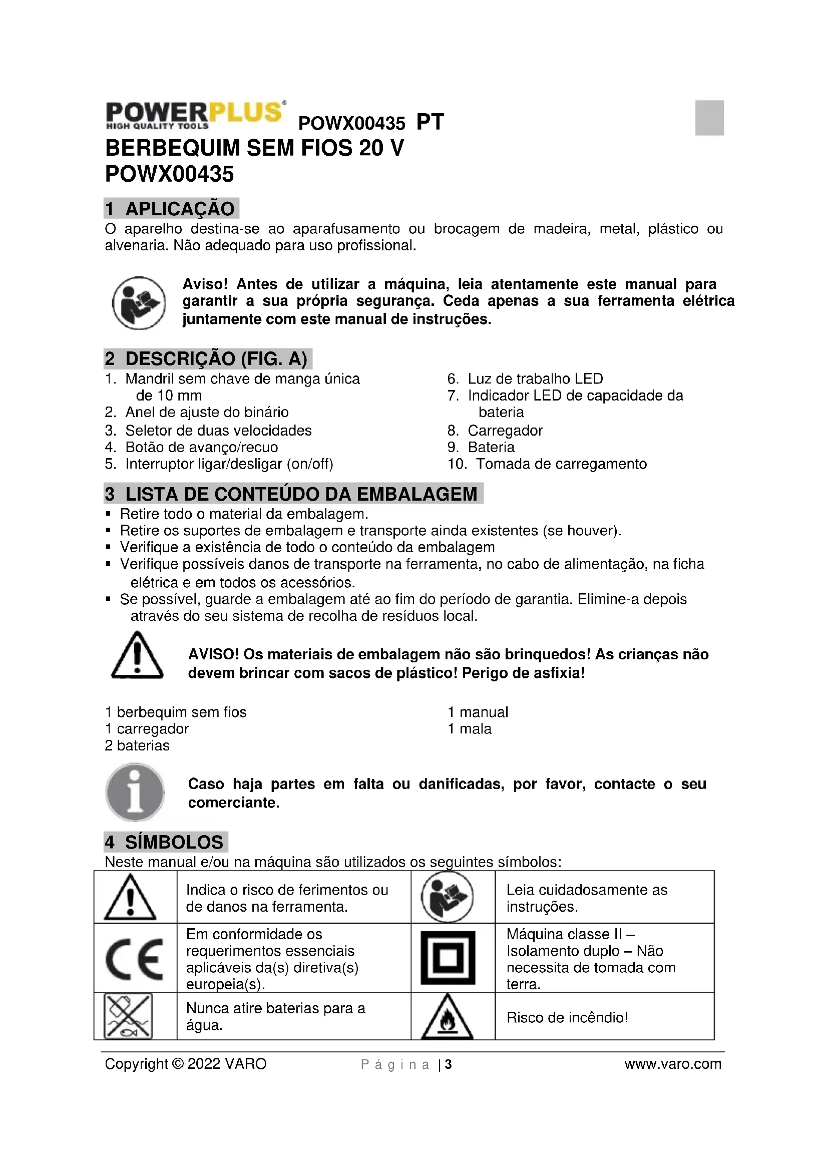 VARO N.V. – Vic. Van Rompuy N.V Joseph Van Instraat 9 – BE2500 Lier – Bélgica, declara que, Designação do aparelho: Berbequim sem fios Marca: POWERplus Modelo nº.: POWX00435 se encontra em conformidade com os requisitos essenciais e outras provisões relevantes das Diretivas Comunitárias aplicáveis, com base na aplicação das normas Europeias harmonizadas. Qualquer alteração não autorizada do equipamento anula esta declaração. Diretivas Europeias (incluindo, se aplicável, as respetivas emendas até à data de assinatura): 2011/65/EU 2006/42/EC 2014/30/EU Normas Europeias harmonizadas (incluindo, se aplicável, as respetivas emendas até à data de assinatura): EN62841-1 : 2015 EN62841-2-1 : 2018 EN55014-1:2017 EN55014-2 : 2015 Detentor da Documentação Técnica: Philippe Vankerkhove, VARO – Vic. Van Rompuy N.V. O signatário atua em nome da administração da empresa, Ludo Mertens Assuntos Regulamentares – Gestor de Conformidade 07/01/2022, Lier - BelgiumPOWX00435 NO Copyright © 2022 VARO S i d e | 1 www.varo.com 1 BRUKSOMRÅDE ............................................................................ 3